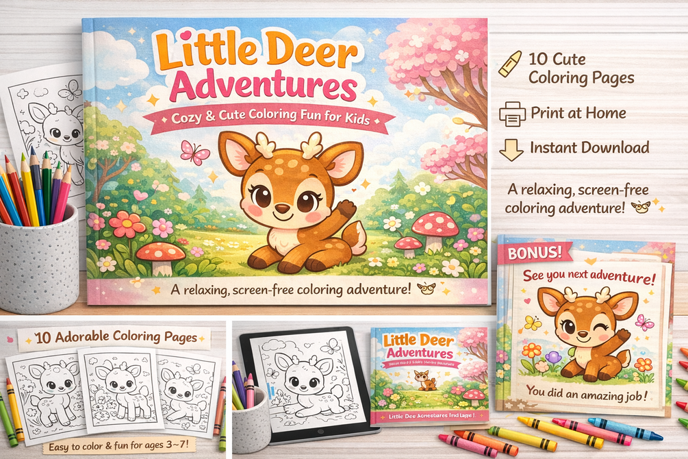 This adorable digital coloring book features a lovable baby deer character that guides kids through calm, cute, and joyful coloring pages.