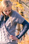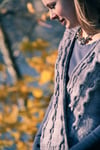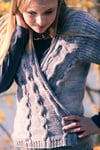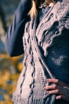 A seamless cardigan with swingy fronts and unusual construction, Silverado is the best kind of simple yet interesting knitting. Texture abounds in the reverse stockinette ground, ribbed sleeves and 3-dimensional wave cables, finished with a simple applied I-cord front and neck edge. The cozy wrap front can be worn open or closed with a pin, and is just the right layer when there’s a chill in the air.