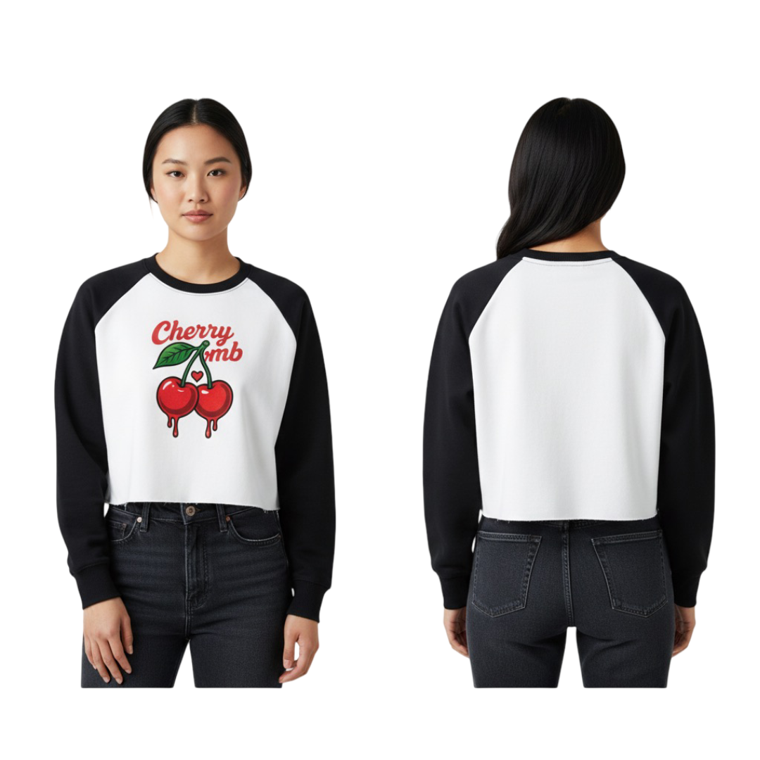 Sweet meets street in the “Cherries Raw-Hem Color-Block Raglan Crop Sweatshirt.” Featuring a bold cherry graphic with vintage flair, a raw-edge hem, and sporty raglan sleeves, this piece blends casual comfort with playful streetwear energy. Perfect for layering or rocking solo with high-waisted jeans.