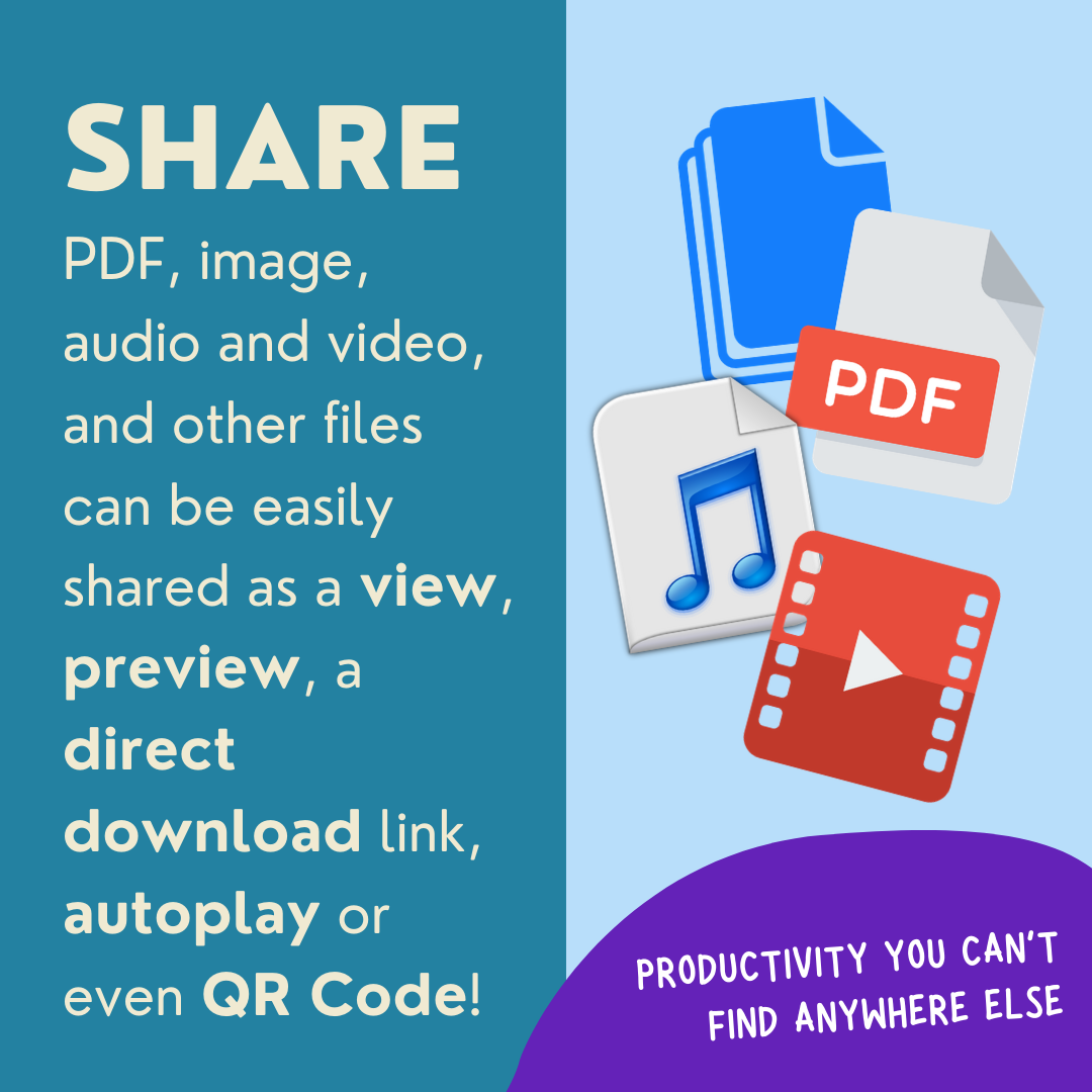 Share PDF, image, audio and video, and other files as a view, preview, or direct download link.