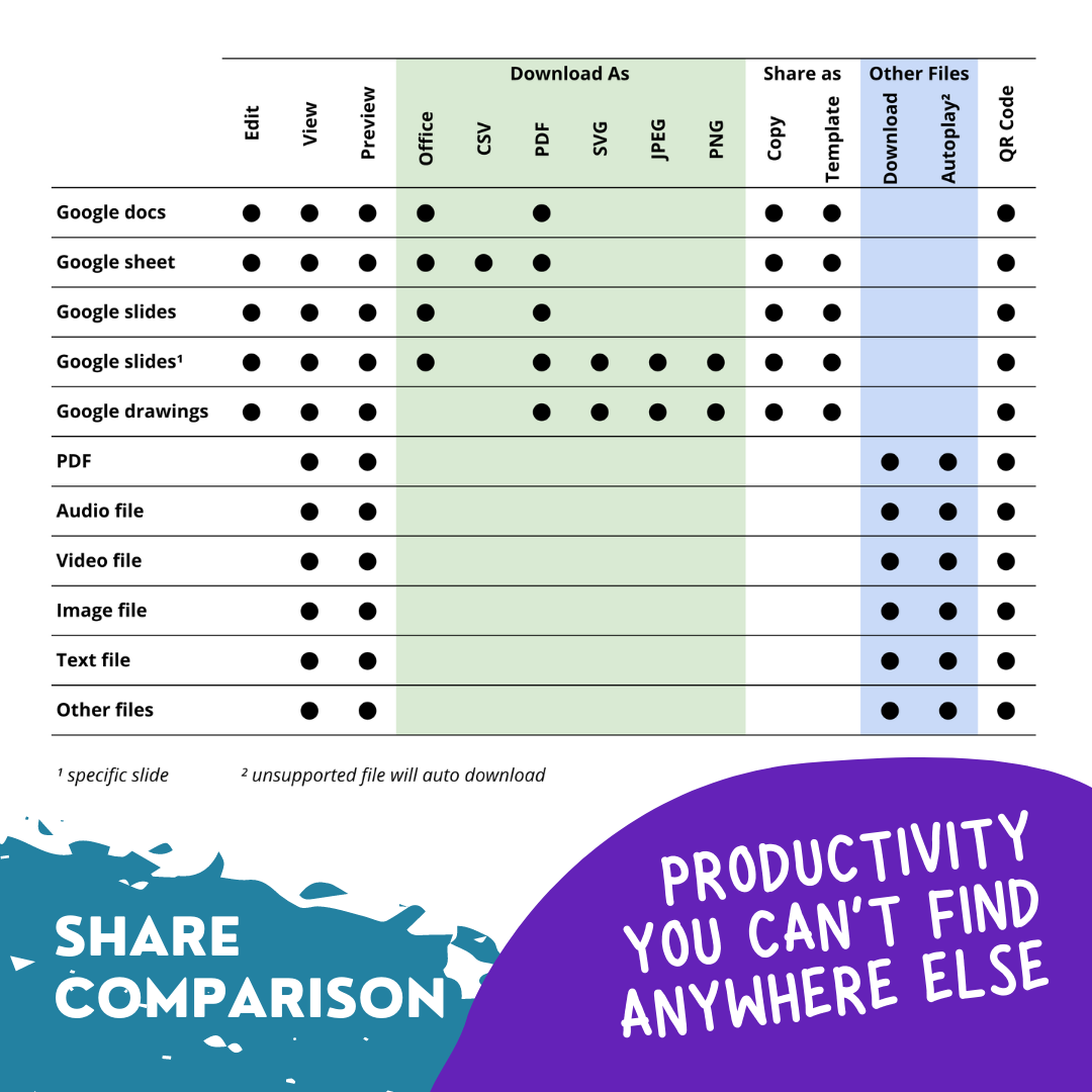 Share Google Docs, Sheets, Slides, and Drawings as edit, view, preview, copy, or template, or share download link as Microsoft Word, Excel, Powerpoint, or even CSV.