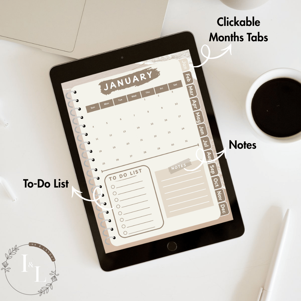 Clickable Digital Planner 2026 - Minimalist Aesthetic Beige Ocean Theme