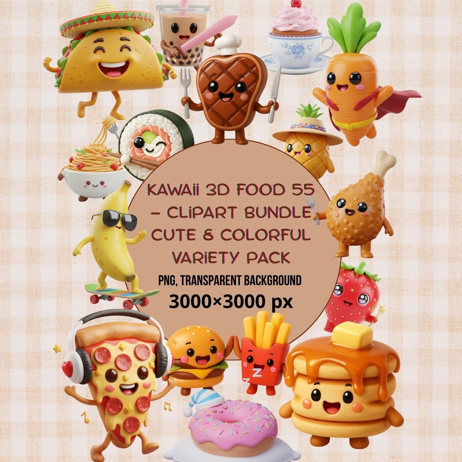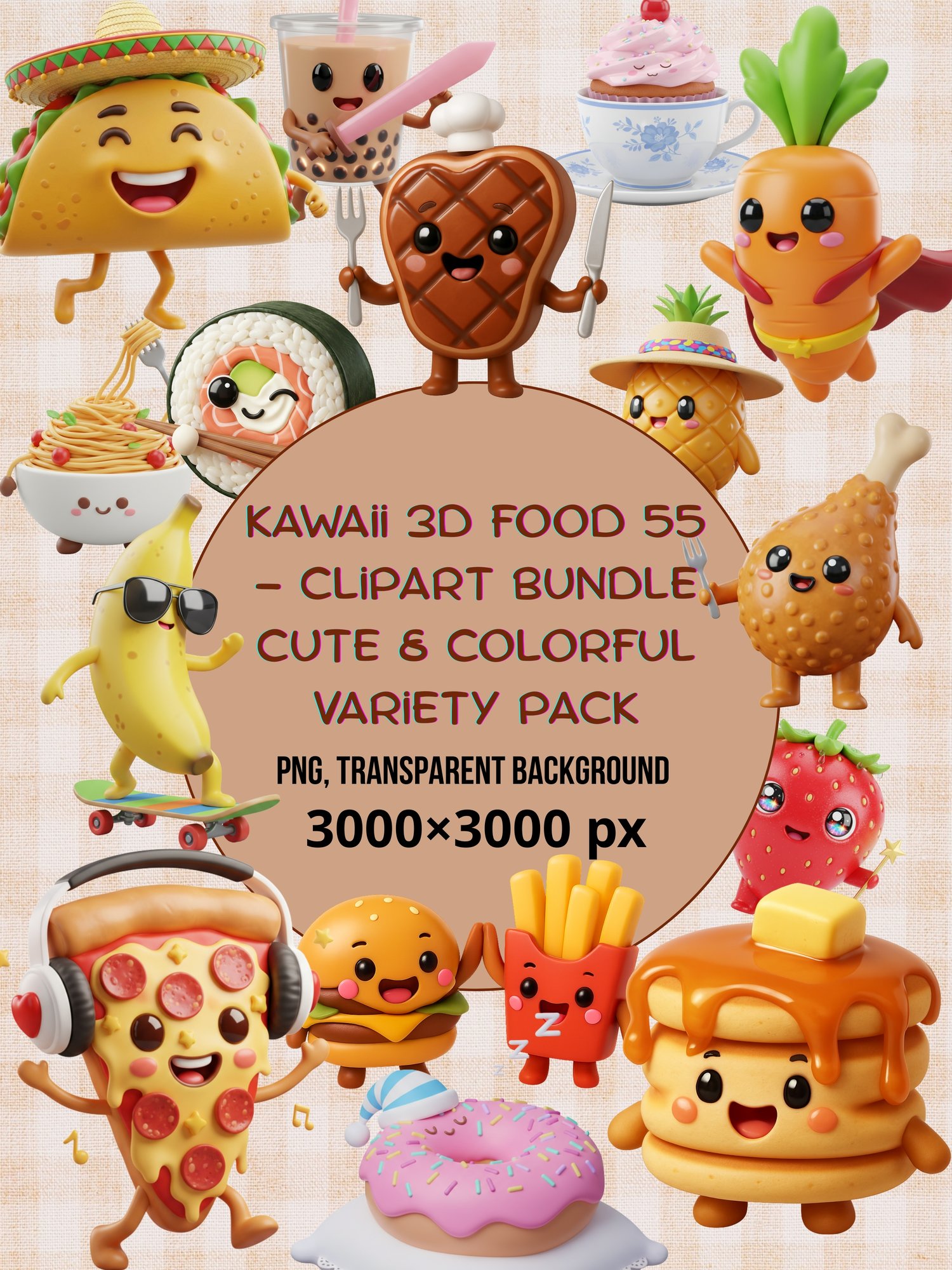 "55 Kawaii 3D Food Clipart Bundle – Cute & Colorful Variety Pack"