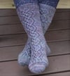 These striking socks feature a veritable quagmire of interlacing cables framed by meandering stockinette. The cable patterning is centered over the front of the leg and top of the foot, leaving the remainder of the sock in comfortable stockinette.