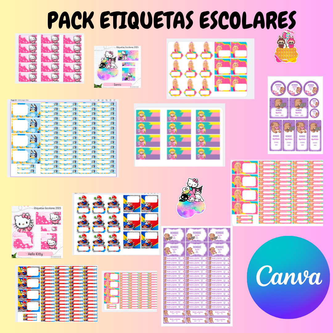 PACK DE ETIQUETAS ESCOLARES EDITABLES EN CANVA DE VARIAS TEMATICAS