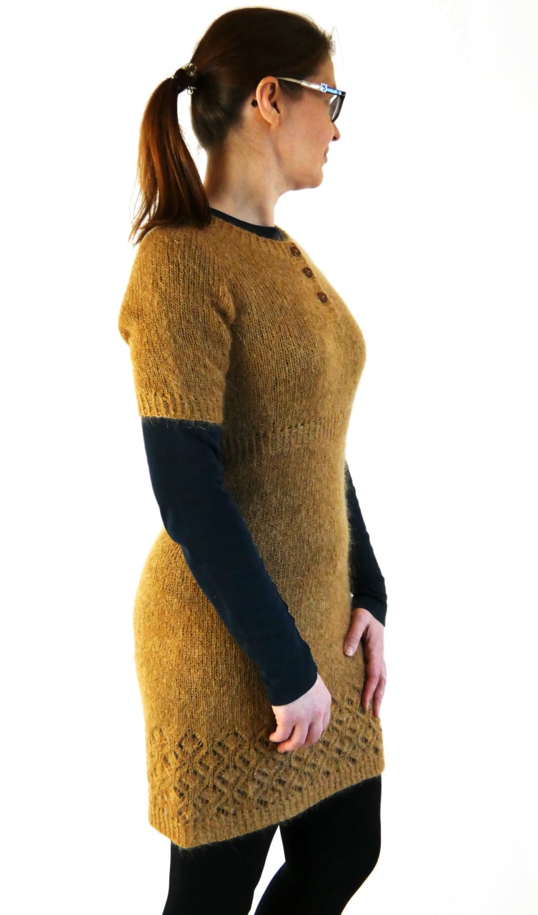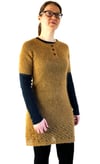 Draconides is a shimmering top-down compound raglan dress that celebrates the annual meteor showers occurring every October. Designed as the fall version of Lyrides, this tunic-length garment has many of the same design elements as the original: a buttoned henley neckline done in twisted ribbing, two options for sleeve length and style, and a delicate lace pattern on the hem.