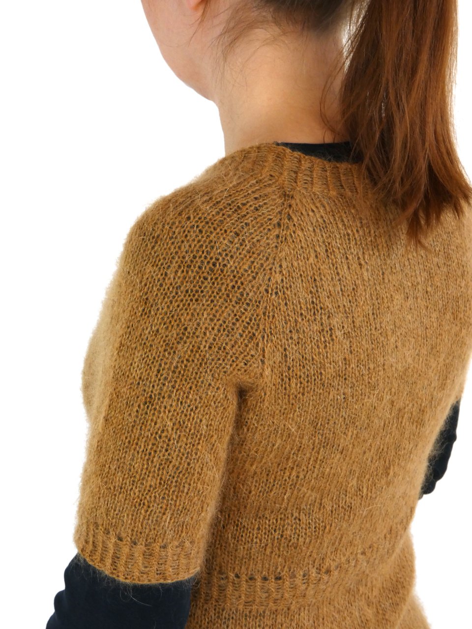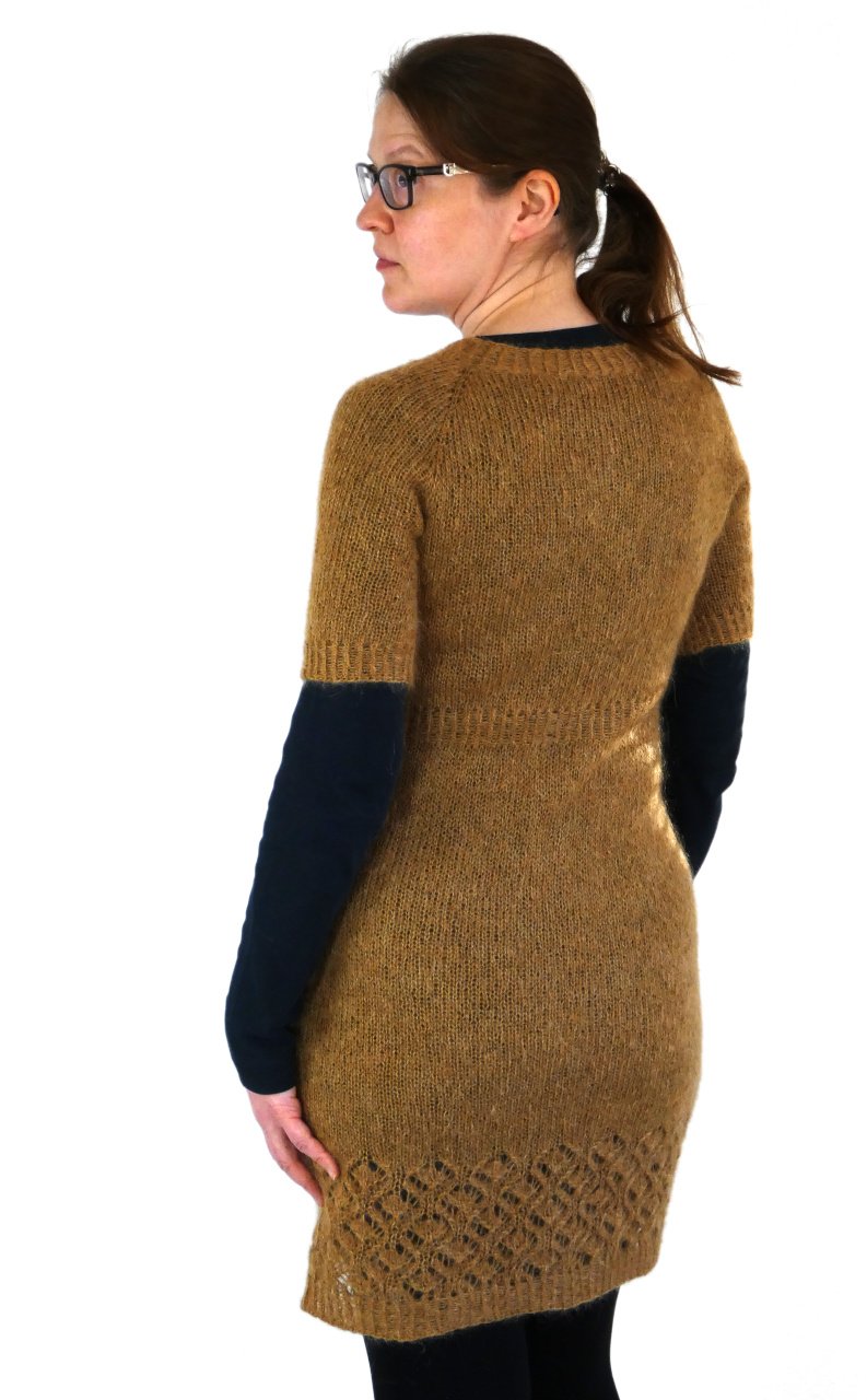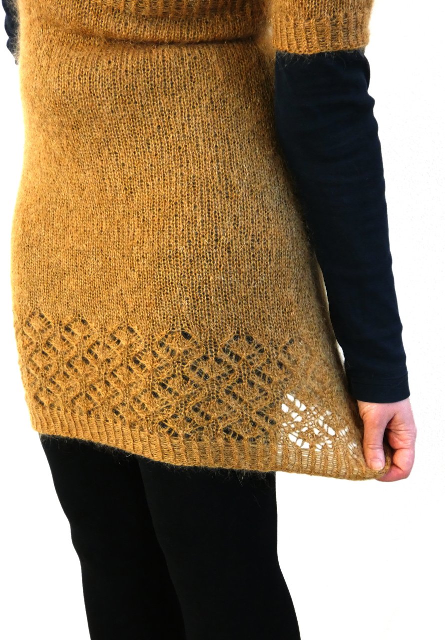Worked with lace-weight silk mohair held double, Draconides features an optional empire waist in twisted ribbing. Compound raglan construction follows the body's natural curves while optional bust shaping ensures a great fit for well-endowed bosoms. The lace hem is gently A-lined, allowing ease of movement around the hips.