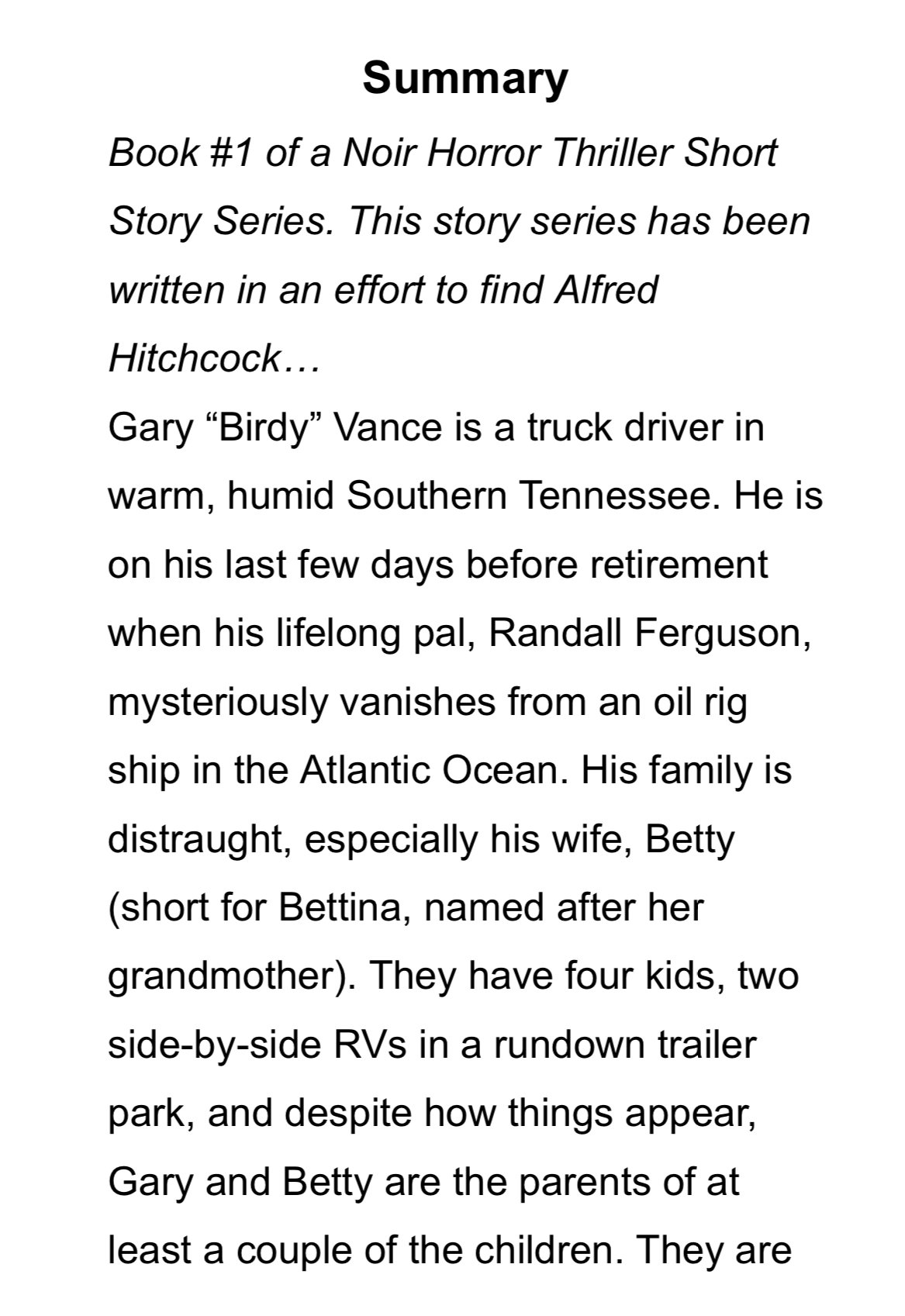 Book #1 of a Noir Horror Thriller Short Story Series (See Amazon, BarnesandNoble.com for remaining series). This story series has been written in an effort to find Alfred Hitchcock… Gary “Birdy” Vance is a truck driver in warm, humid Southern Tennessee. He is on his last few days before retirement when his lifelong pal, Randall Ferguson, mysteriously vanishes from an oil rig ship in the Atlantic Ocean. His family is distraught, especially his wife, Betty (short for Bettina, named after her grandmother). They have four kids, two side-by-side RVs in a rundown trailer park, and despite how things appear, Gary and Betty are the parents of at least a couple of the children. They are sure that Randall never knew before his disappearance. Did he know? And what instructions did he leave his sister Norma Wildes (who, by the way hasn’t been seen in decades either). Watch as the plot unfolds. Can this writer find Alfred Hitchcock’s storytelling and words to spin a truly remarkable series of suspense, intrigue, horror, and noir thrill? Read for yourself.