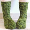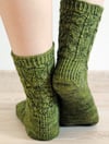 Interleaved socks were inspired by the lush foliage at the height of summer when everything in nature is at its fullest. The socks feature an easily memorizable lace-and-cable pattern of intertwining leaves, rising from the ground up.These socks are knitted from the toe up in the round. The pattern features a gusset-and-flap heel construction that doesn’t require picking up stitches. Right and left socks are identical and can be worked two at a time.