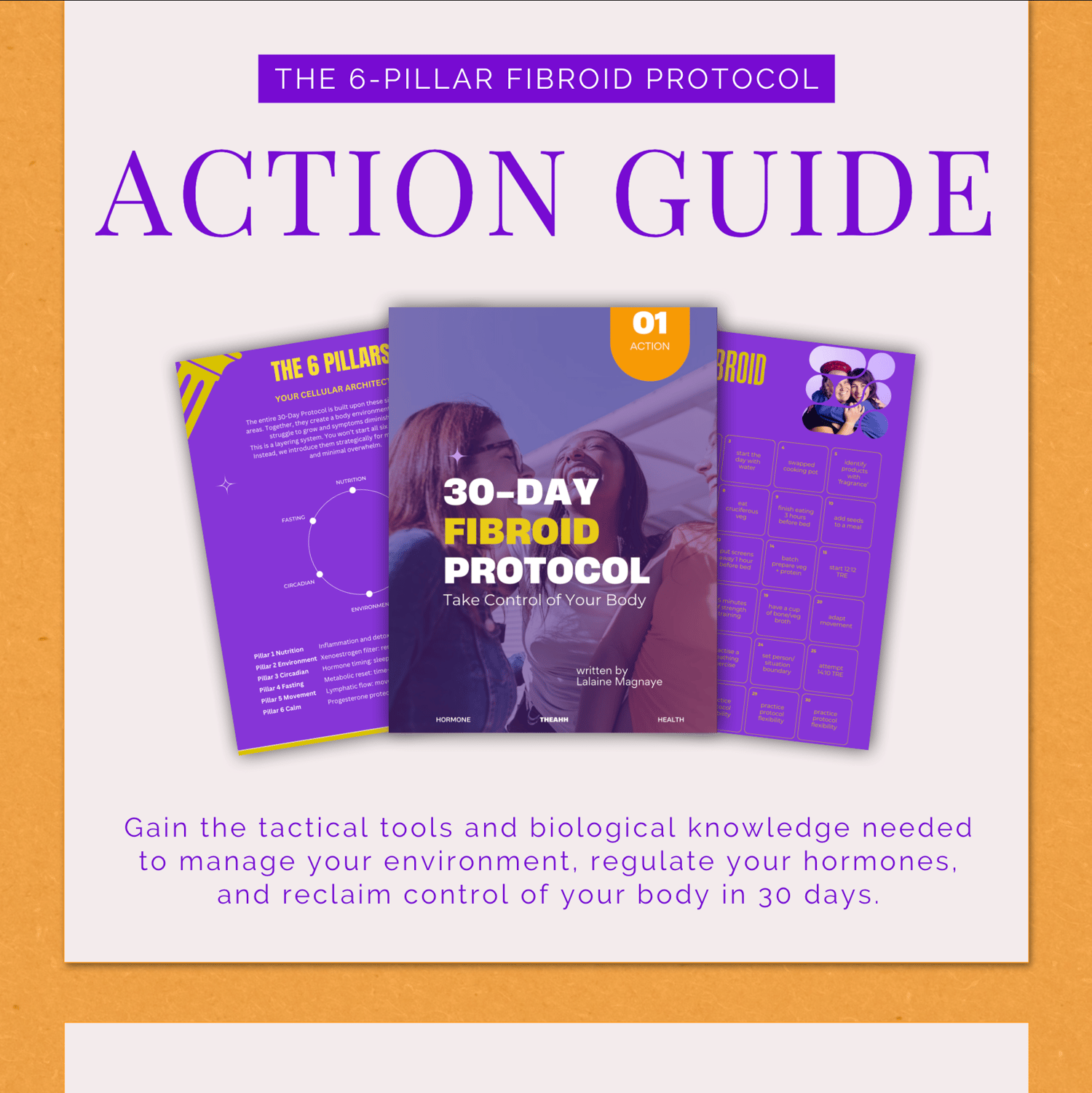 The 30-Day Fibroid Protocol Action Guide is the exact daily blueprint designed to manage the environmental and metabolic factors that fuel fibroid growth. Stripped of complexity and ambiguity, it focuses on the what and the when to help you move from survival mode back to yourself.