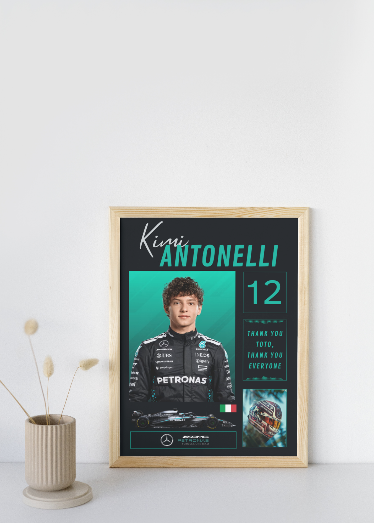 - A sophisticated poster celebrating Mercedes driver Kimi Antonelli.