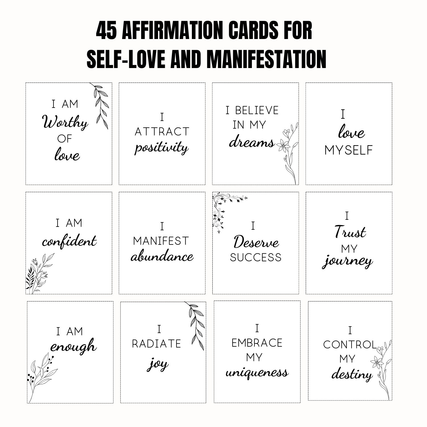 Hey there! Looking for positive affirmation cards to help you manifest your goals and focus on self-care? Look no further! Our set of 45 self-love and self-care affirmation cards is perfect for boosting positivity and enhancing your daily routine. Download now and start your journey to a more confident, self-loving you! 💖