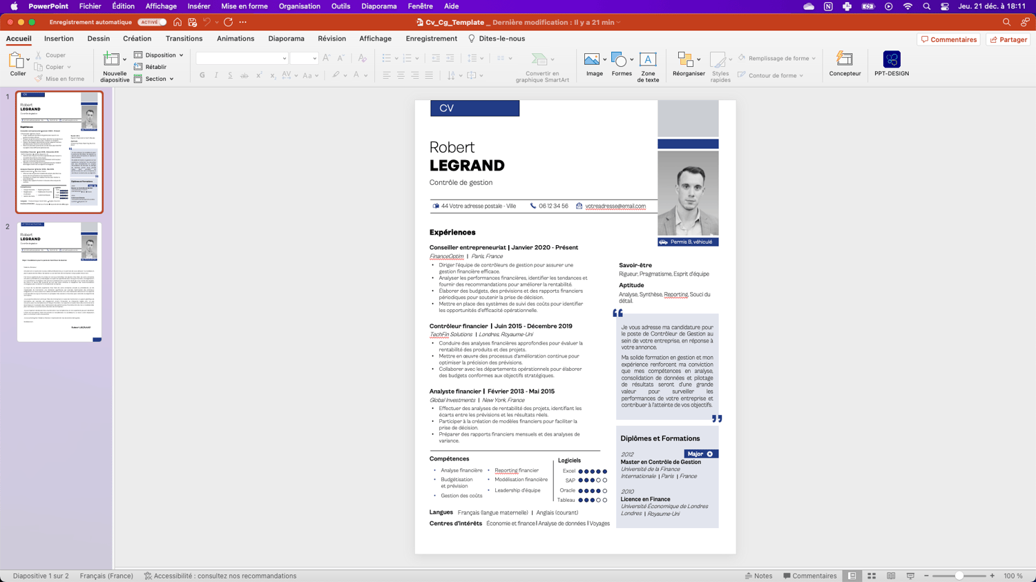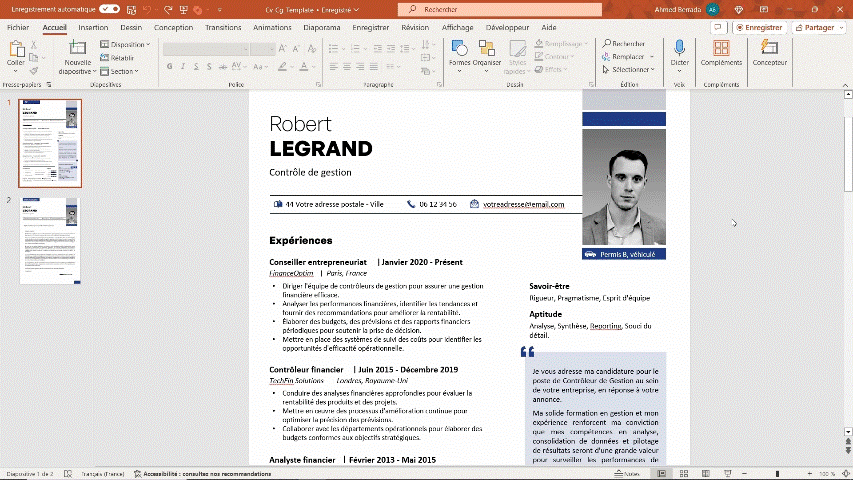 Adapté à tous les secteurs professionnels, notre modèle convient aussi bien à ceux qui cherchent à évoluer dans leur domaine actuel qu'à ceux qui envisagent une transition vers de nouveaux horizons. En optant pour notre template PowerPoint CV, vous avez l'assurance de créer un curriculum vitae remarquable qui vous démarquera des autres candidats, augmentant ainsi vos chances de réussite dans votre démarche de candidature. Donnez un coup de pouce à votre carrière dès maintenant !