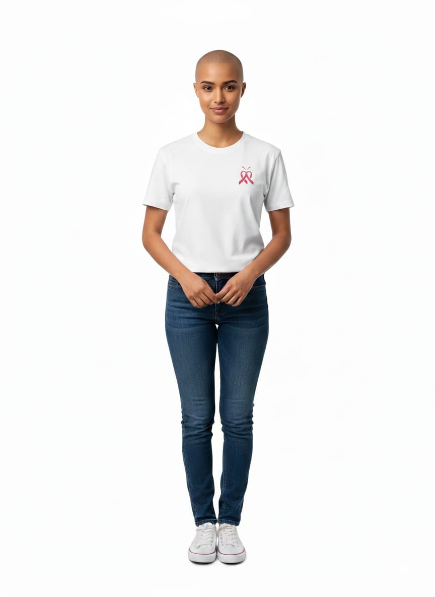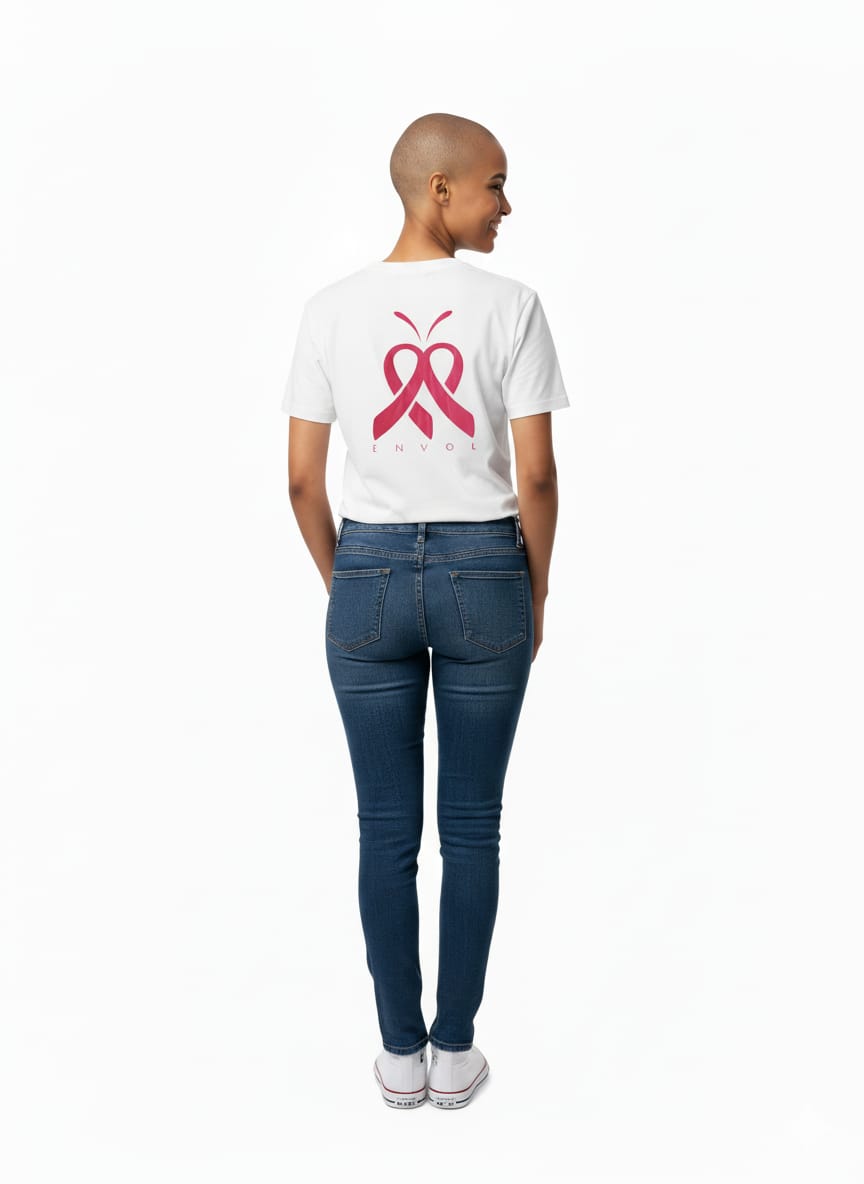 Un t-shirt blanc minimaliste, orné du logo Envol en rose. Une couleur, un combat. Portez le soutien, montrez la force.