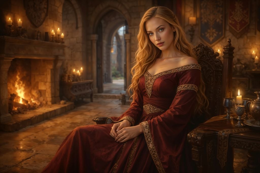 Warm, regal, and quietly enchanting, this 10K ancient fantasy artwork captures a noble lady seated in the glow of a great hearth within a stone hall of timeless beauty. Wrapped in a deep crimson gown and surrounded by candlelight, carved wood, and medieval splendor, she radiates elegance, calm authority, and storybook grace.