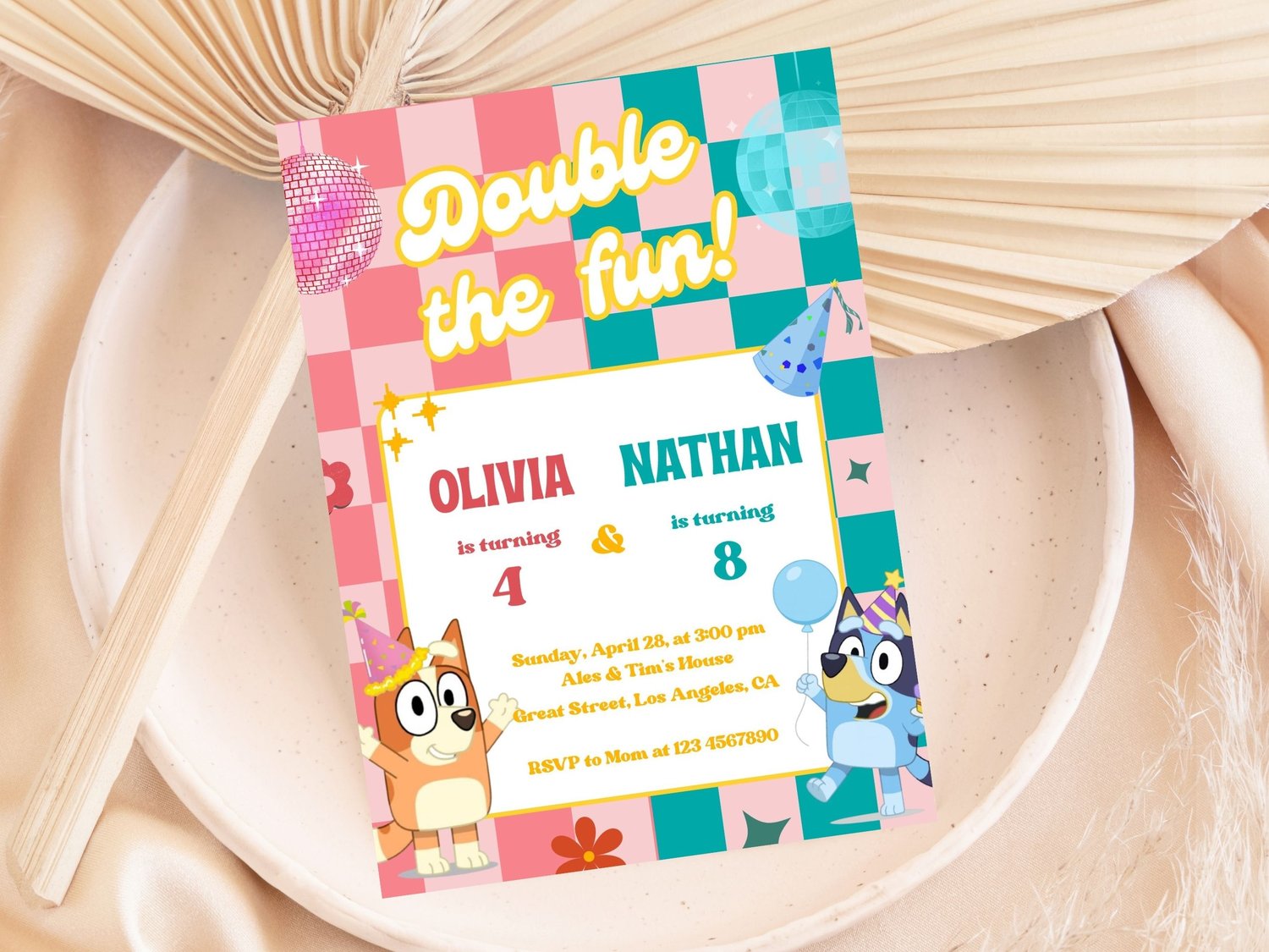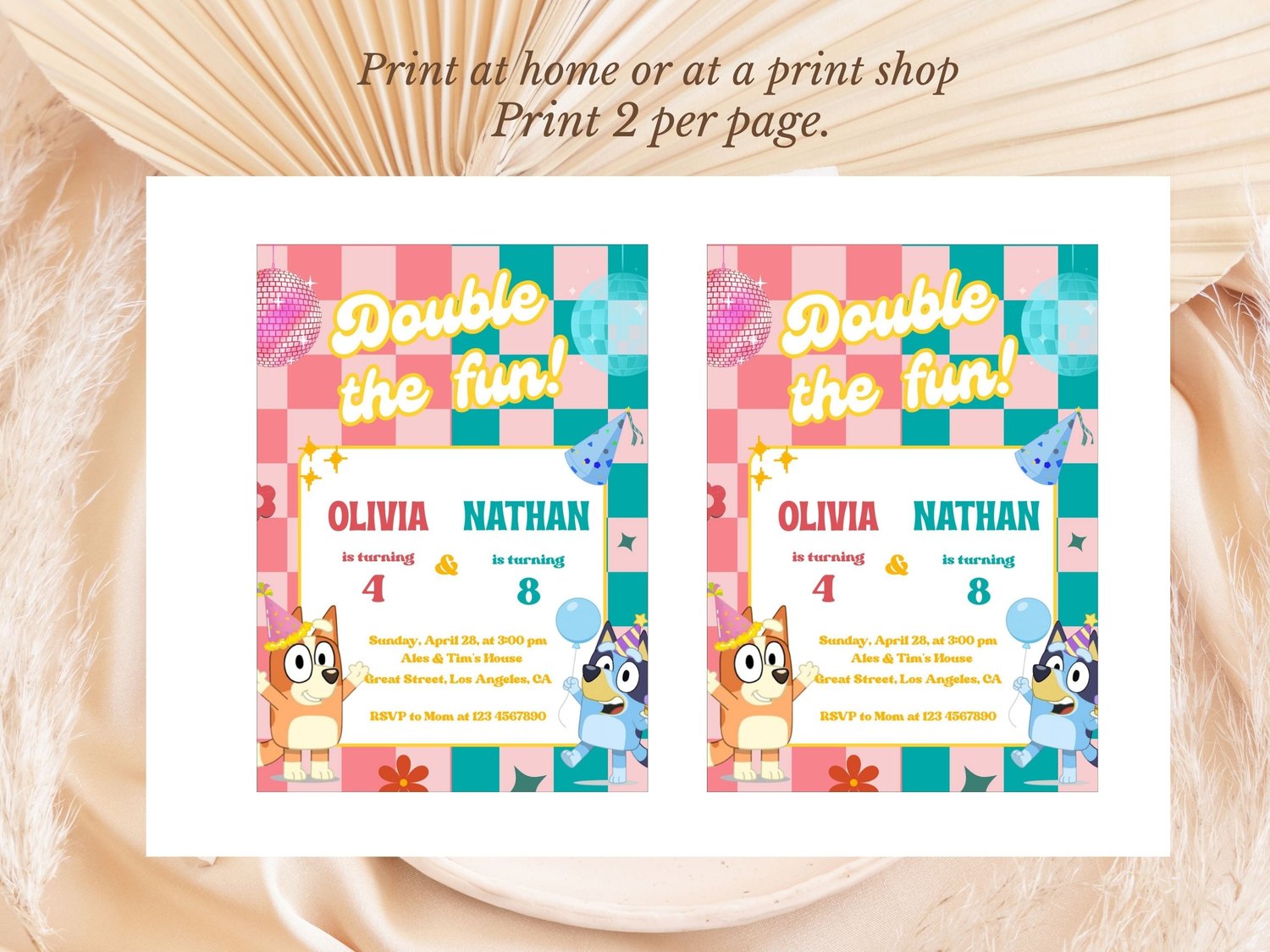 Bluey Double Birthday Invitation Template | Joint Sibling Party Invite | Editable Boy Girl Birthday Invite | Bluey Theme Kids Party