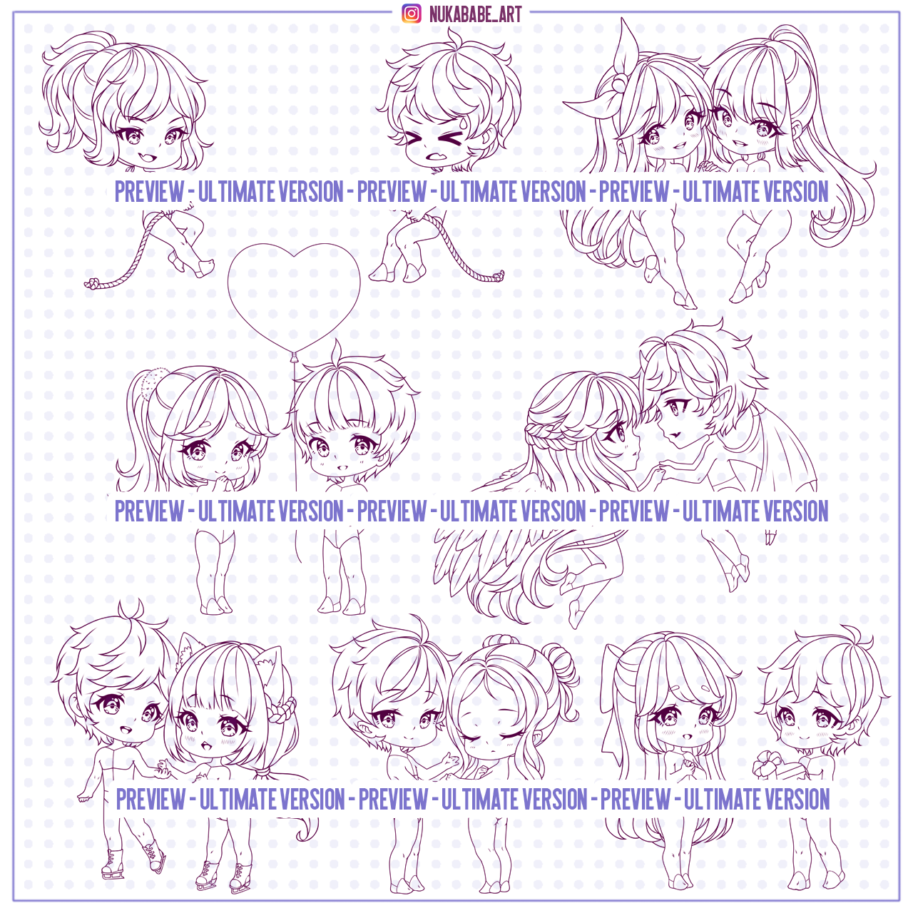 This stamp set for Procreate contains 16 high quality chibi couple bases. This base pack is inclined towards advanced and themed poses with more details, which makes it a nice addition to Volume 1 and Volume 2 of my chibi couples collection that contain more common and basic type of poses. Like my other couple sets, this one includes same sex and different sex poses.