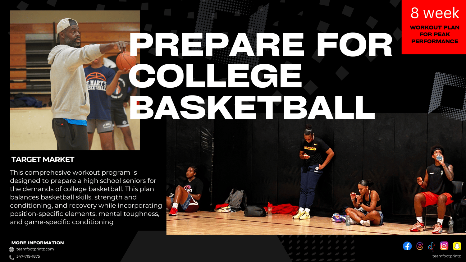 Welcome to the 8-Week Post High School Workout Program, your ultimate guide to preparing for the transition from high school to college basketball. As a senior player heading to the next level, you’ve already proven yourself as a competitor—but college basketball is a whole new game. This program is designed to bridge the gap, equipping you with the skills, conditioning, and mindset needed to excel as a collegiate athlete.