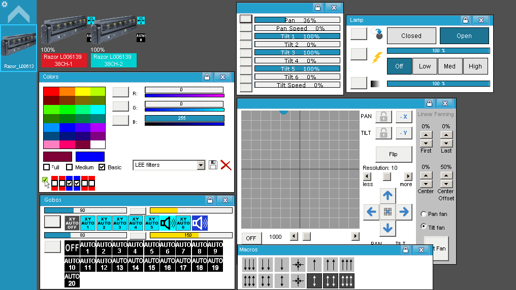 • Panel de Macros: Accesos directos a posiciones particulares de Tilt de las 6 cabezas.