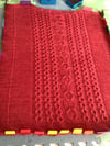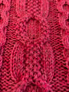 The red sample shown was knit in Wool is the Answer 4 ply yarn (100 gms = 420 metres). It is 75% super wash merino and 25% nylon. You will need 6 x 400m of yarn and work two strands together. I used three balls of a scarlet colour and three balls of a wine shade which, when worked together, gave a pleasant marled effect. The green version was made from Wool is the Answer Emerald plus some yarn I found in a yarn shop called Loop, in London, and is called Snake.