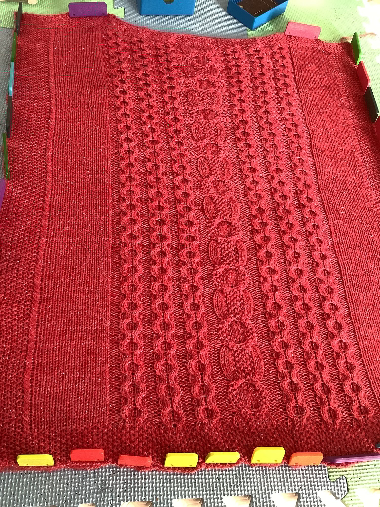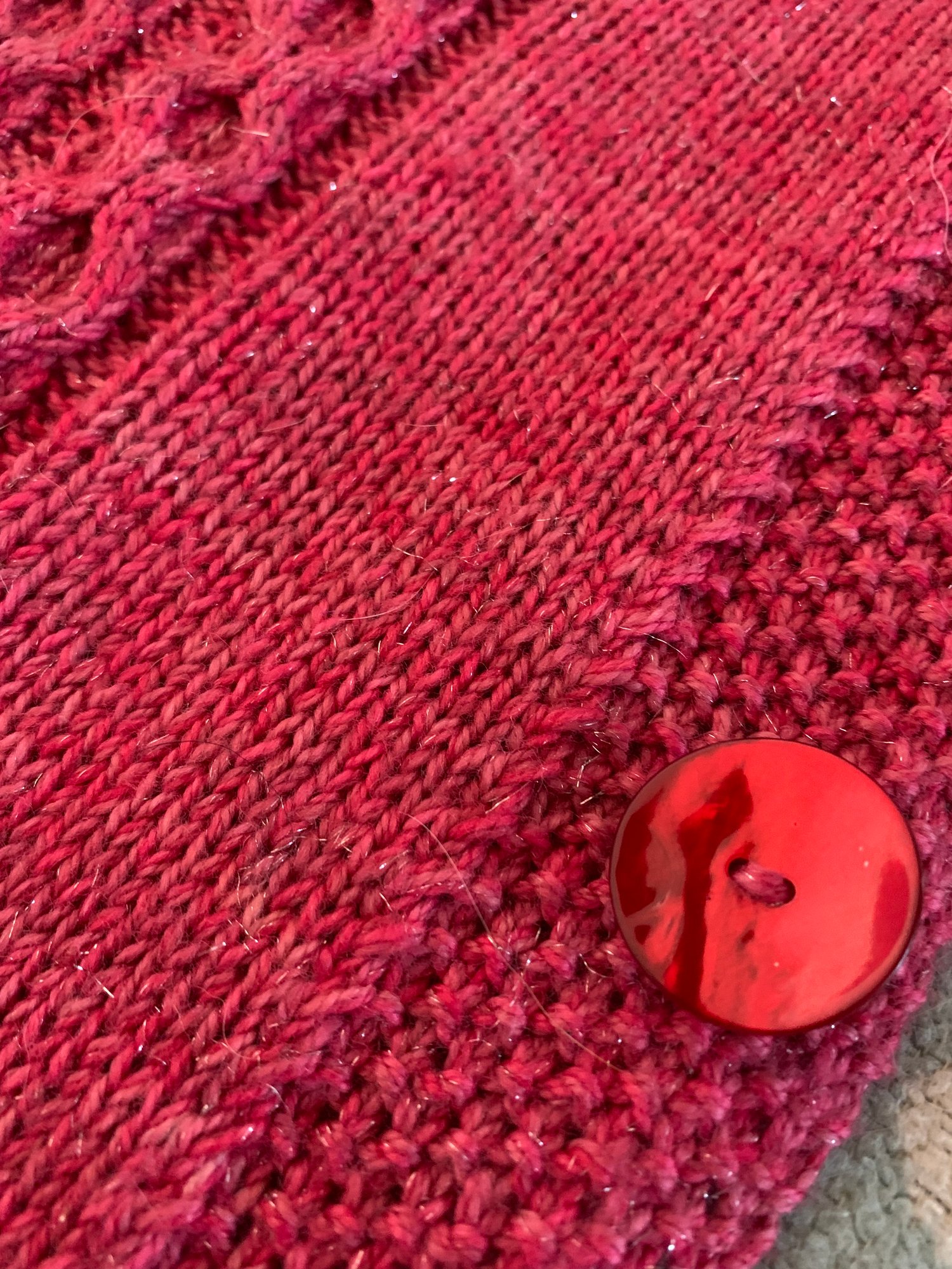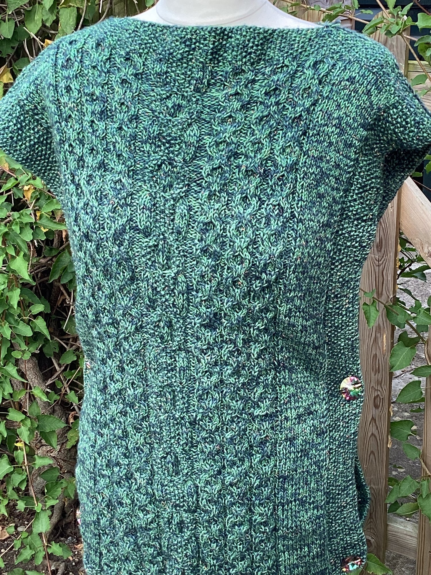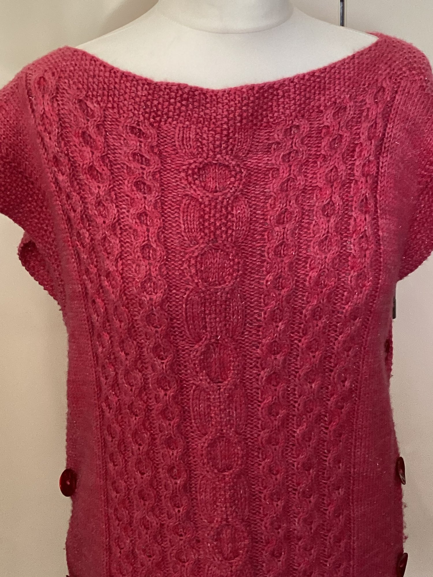 This is a top-down ‘pop over’ type jumper without sleeves. It is fastened at both sides with six buttons (total) and woollen crocheted loops. It’s worked mostly in cable with stocking stitch and moss stitch edges. The beauty of this type of jumper is that the cable stitches pull it in a little so it really is an easy to wear item as there’s plenty of stretch. When blocked, the garment is roughly 64cm (25 inches) in width with a length of approximately 80cm (32 inches). If it is required to be slightly wider (or narrower) then the 14 stitches of the stocking stitch panel at either side is approximately 3 inches or 8 cm wide so it can be sized up or down at this point. But as I’ve said, it’s amazing just how much cable stitches can stretch!