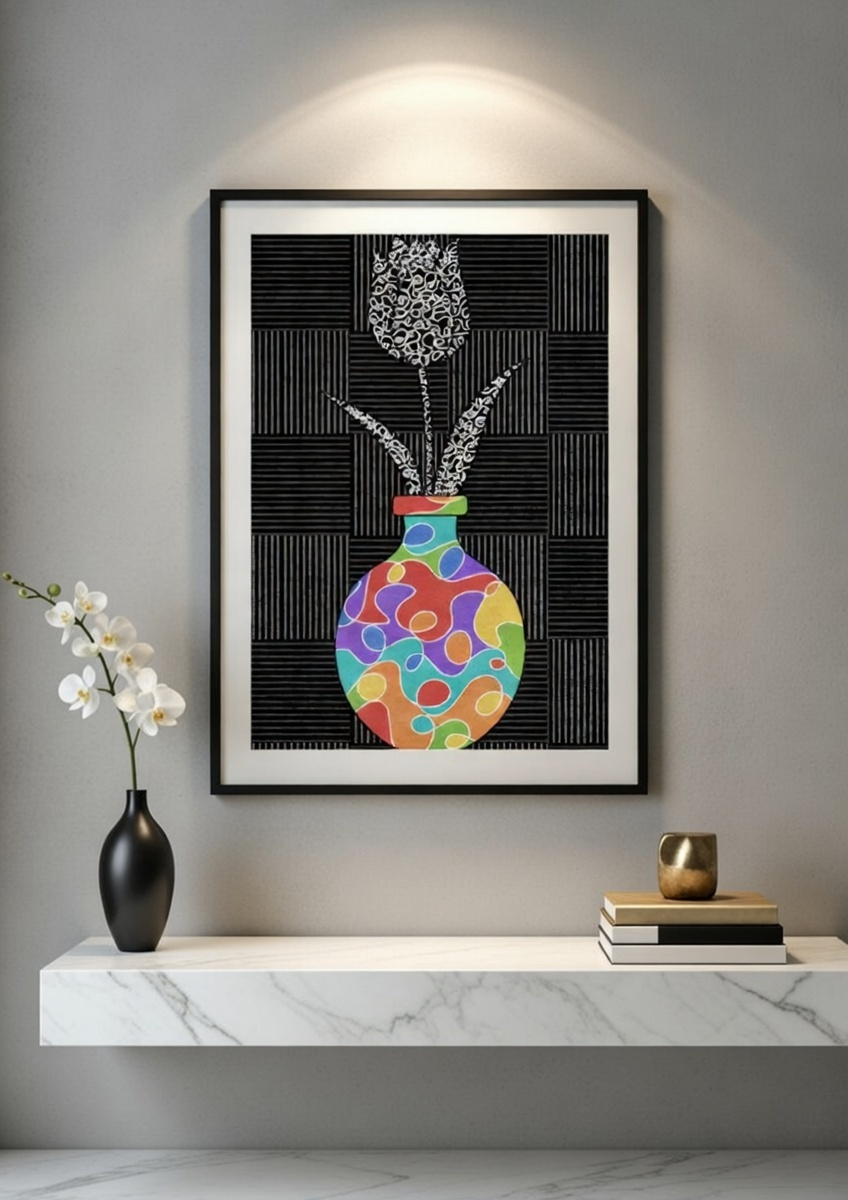 Only the Vase Had Color presents a scene dominated by black, white, and gray, where the background and the tulip blend together in monochrome patterns. The white, scribbled tulip almost disappears into its surroundings, emphasizing a sense of uniformity and quiet stillness. In contrast, the vase stands out with bright, colorful shapes, becoming the only element that truly draws the eye. The artwork highlights contrast and focus, suggesting how color—and meaning—can exist in a single place even when everything else feels muted or the same.