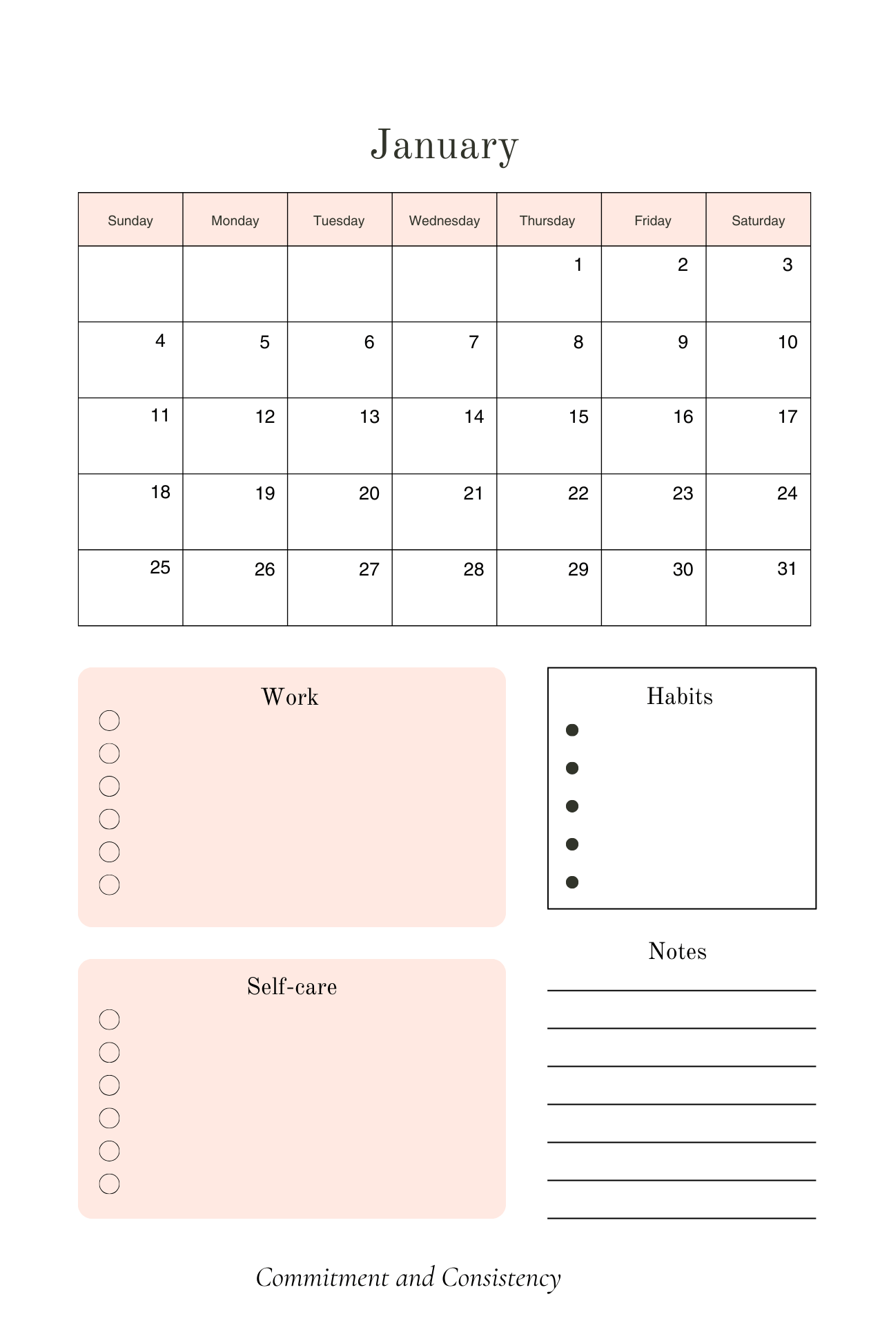 Full monthly calendar with space for: