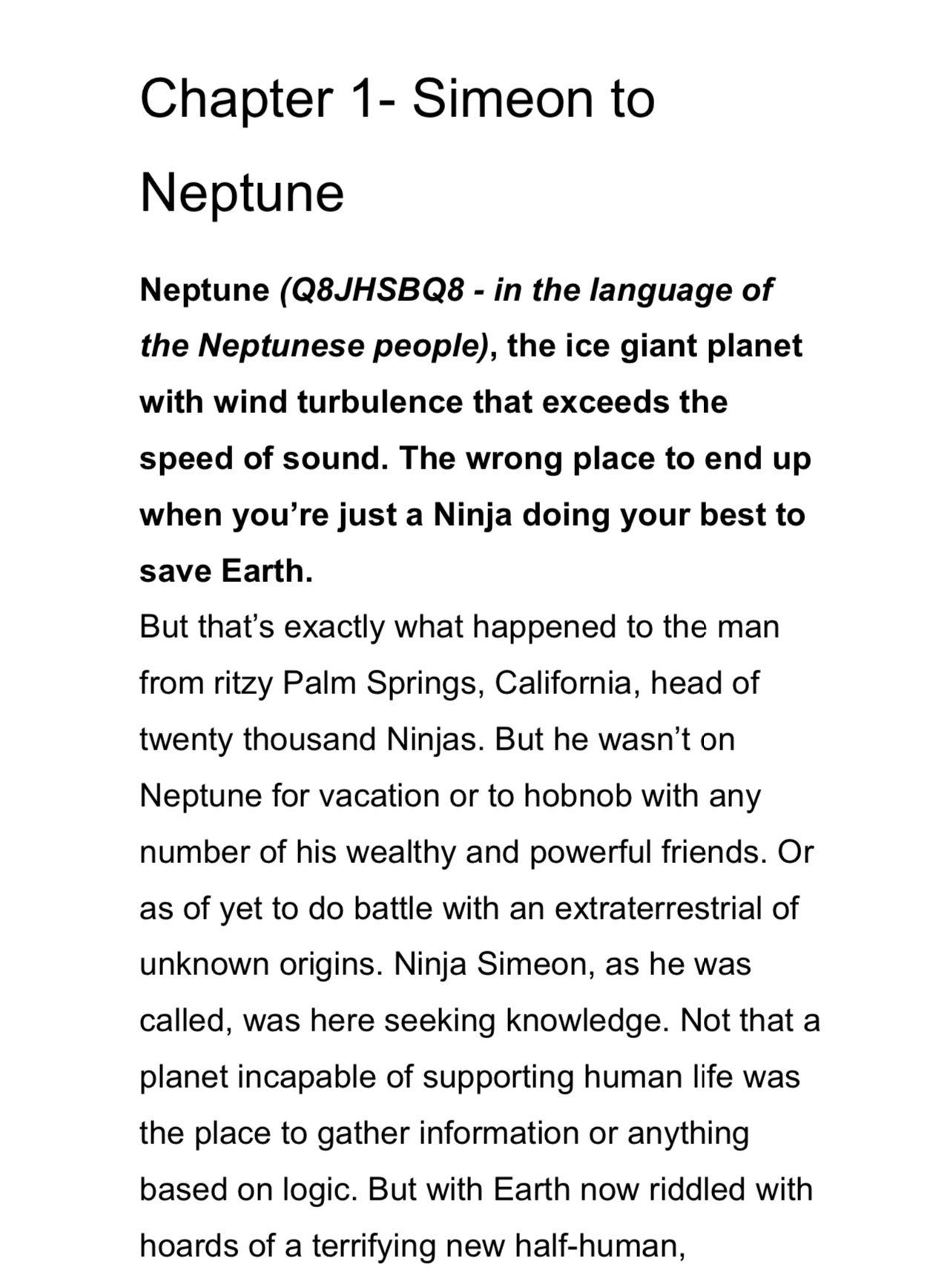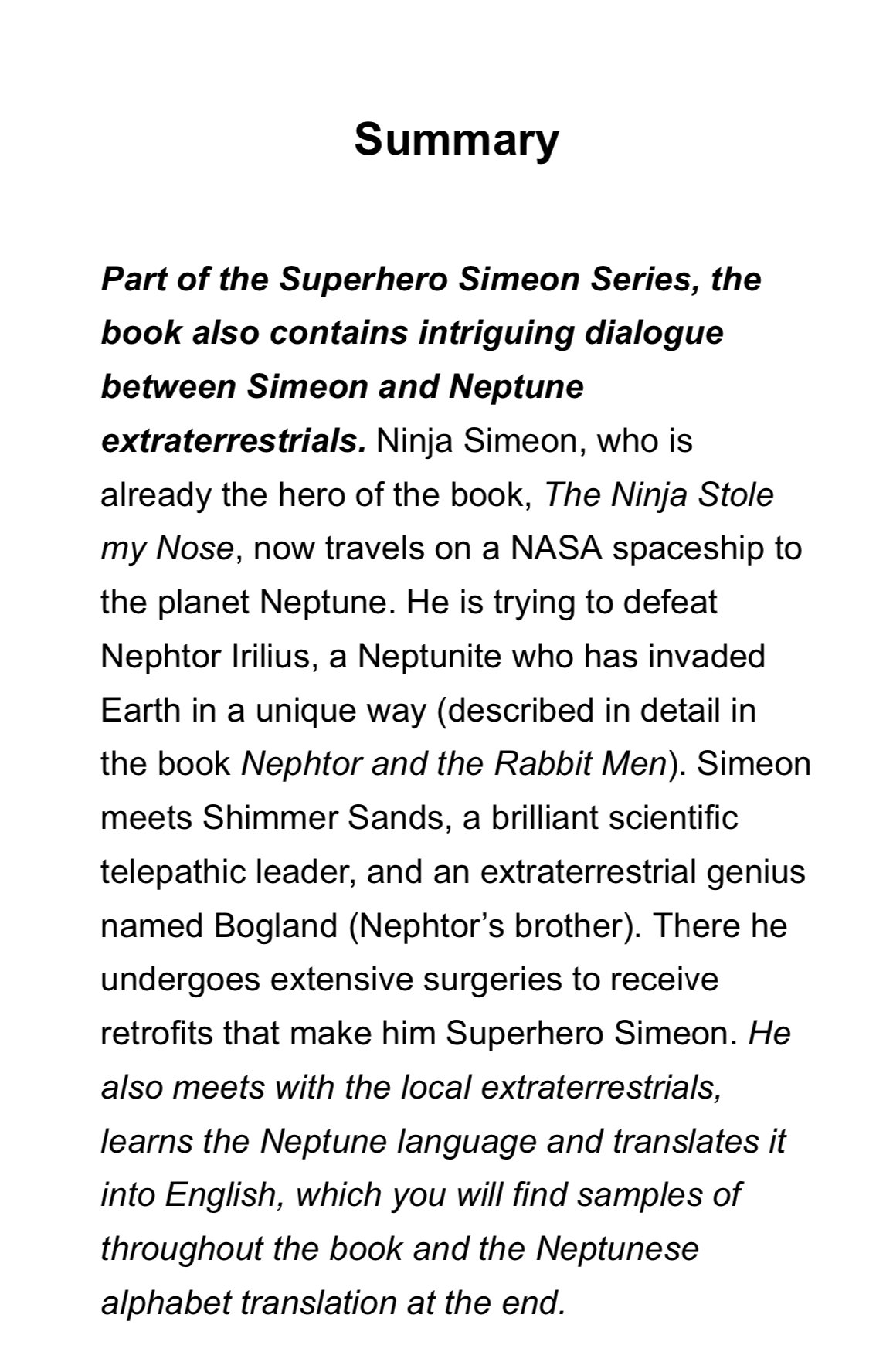 Part of the Superhero Simeon Series, the book also contains intriguing dialogue between Simeon and Neptune extraterrestrials. Ninja Simeon, who is already the hero of the book, The Ninja Stole my Nose, now travels on a NASA spaceship to the planet Neptune. He is trying to defeat Nephtor Irilius, a Neptunite who has invaded Earth in a unique way (described in detail in the book Nephtor and the Rabbit Men). Simeon meets Shimmer Sands, a brilliant scientific telepathic leader, and an extraterrestrial genius named Bogland (Nephtor’s brother). There he undergoes extensive surgeries to receive retrofits that make him Superhero Simeon. He also meets with the local extraterrestrials, learns the Neptune language and translates it into English, which you will find samples of throughout the book and the Neptunese alphabet translation at the end.