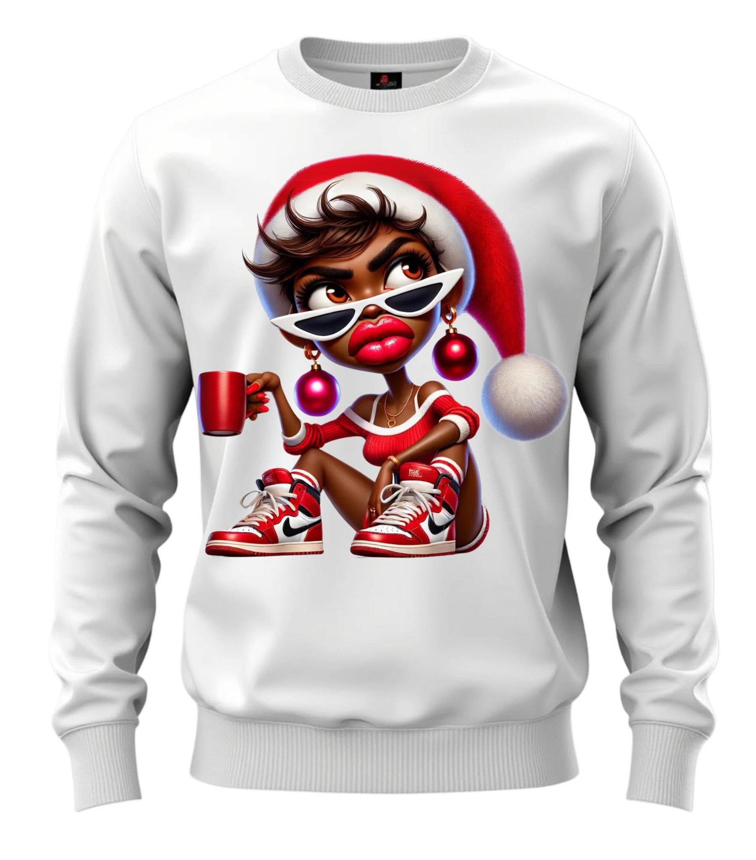 The image showcases a white sweatshirt featuring a striking design of a stylish chibi African American woman. She has a confident, laid-back vibe with curly hair adorned by a Santa hat. Her large, expressive eyes are highlighted by oversized red cat-eye glasses, and she has full, glossy pink lips. She wears statement red ball earrings that resemble Christmas ornaments, matching her festive aesthetic.