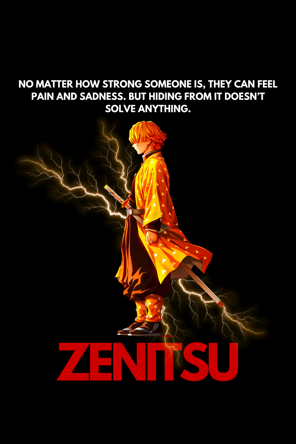 Inspired by one of the most electrifying anime heroes, this tee symbolizes courage, emotion, and resilience. Featuring a stunning design of Zenitsu surrounded by lightning and an inspiring quote — “No matter how strong someone is, they can feel pain and sadness. But hiding from it doesn’t solve anything.”