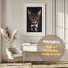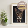 Printable street cat portrait wall art. Grey cute adorable pet animal elegant red tie poster