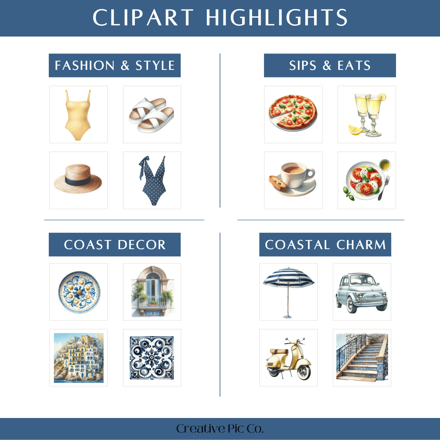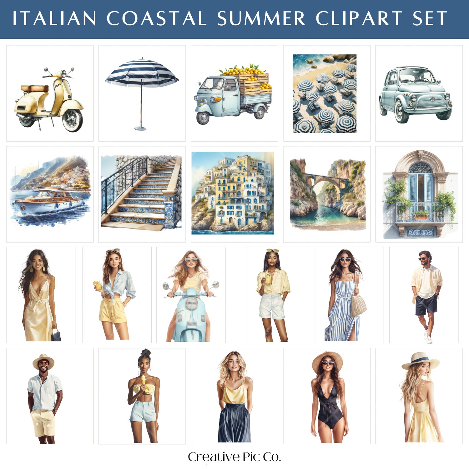 Transport your designs to the sun-soaked Italian Riviera with this Italian Coastal Clipart Collection. Featuring 41 high-resolution PNGs, this set captures the essence of Mediterranean summer: chic fashion, limoncello, gelato, pizza, pasta, scooters, coastal houses, and signature blue-and-white ceramics. Perfect for invitations, travel blogs, branding, and social media graphics, all illustrations are hand-rendered in a soft watercolour style with transparent backgrounds for easy use in both print and digital projects.