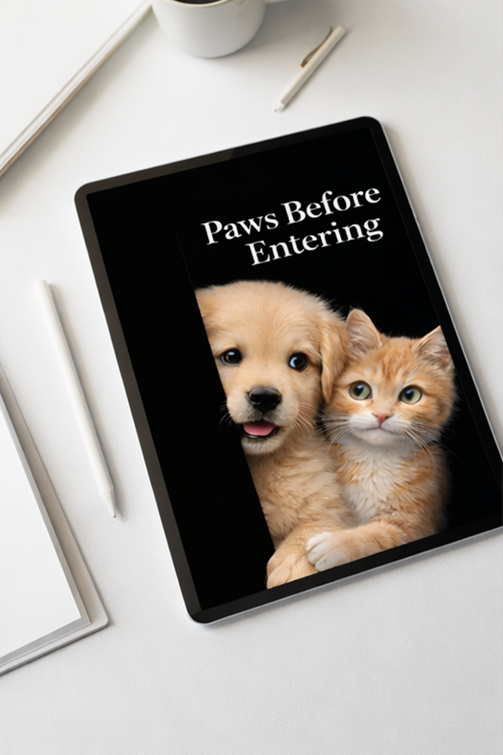 Bring joy to your walls with Paws Before Entering, a beautifully composed digital wall art piece showcasing a sweet puppy and kitten peeking through a doorway with curious, welcoming expressions. AI generated.