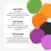 + Detailed Hex Codes, RGB, and CMYK values for each color