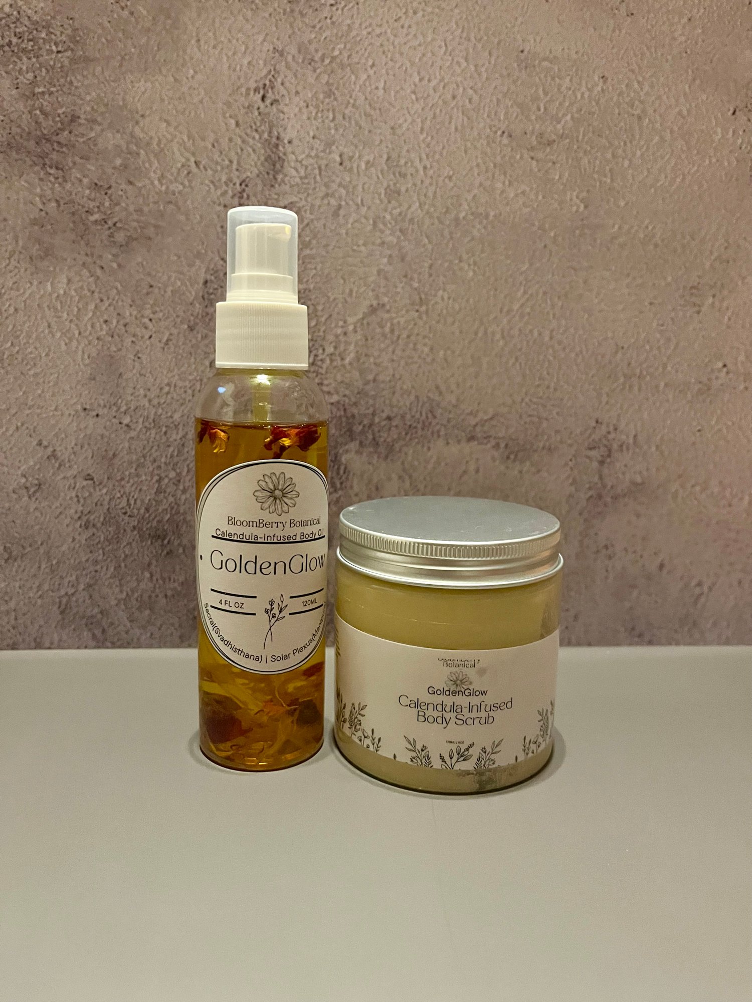 Reveal your skin’s natural brilliance with our GoldenGlow Radiance Scrub—a botanical blend designed to gently exfoliate, detoxify, and nourish both skin and spirit. Infused with our signature GoldenGlow Calendula Oil, this revitalizing scrub helps restore a radiant glow while offering a moment of tender, intentional self-care.