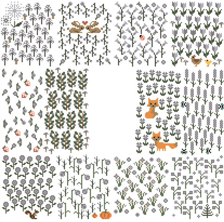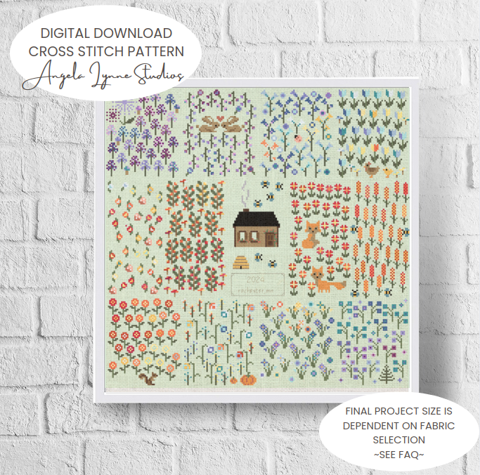 A flower garden to mark the seasons. High-low temperature stitch-along garden with flowers, mushrooms, and a few fun surprises. This pattern has each month divided into beds, with one flower/plant per day. This pattern also contains a blank space for customization, with a few blank houses and elements for you to add and customize, making this pattern your very own.
