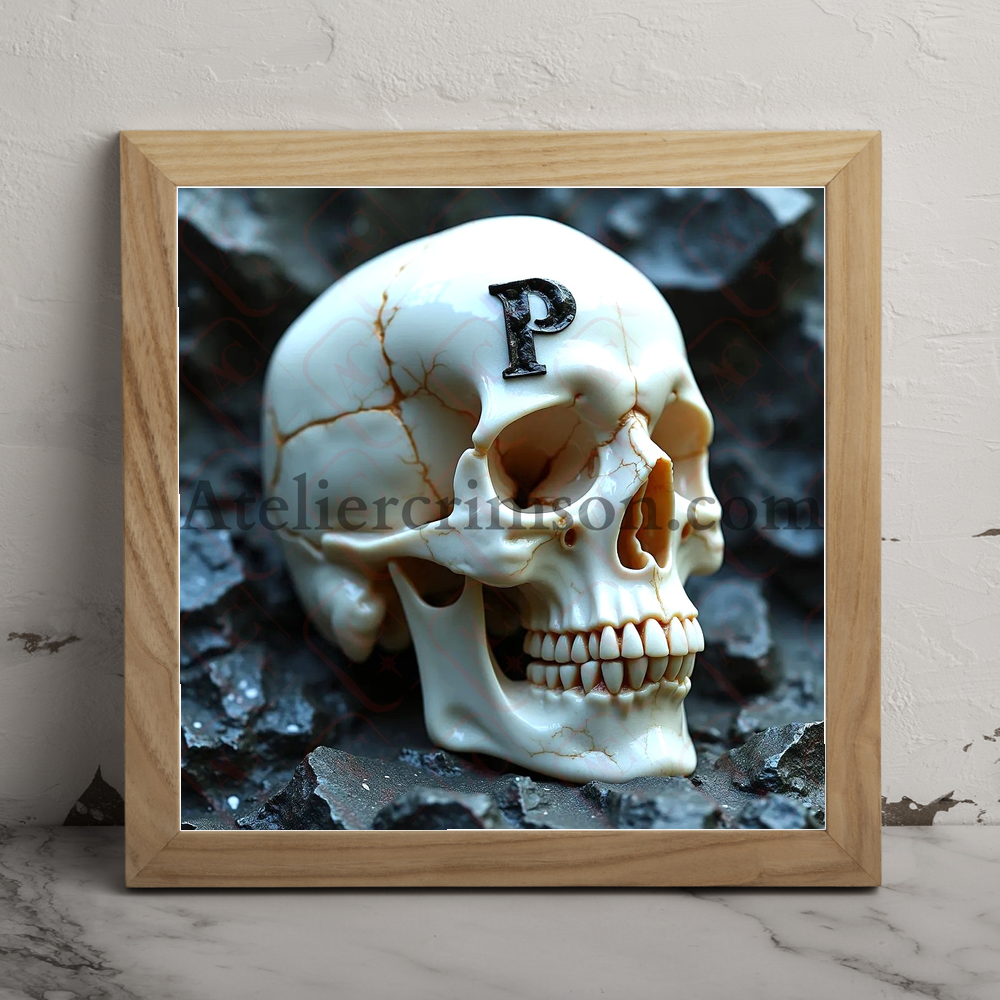 The letter P skull obsidian marble deeply engraved character on the forehead of a white marble skull. The character, filled with dark obsidian, contrasts sharply against the pale skull. Set against a black crystalline background, the skull and character dominate the image.
