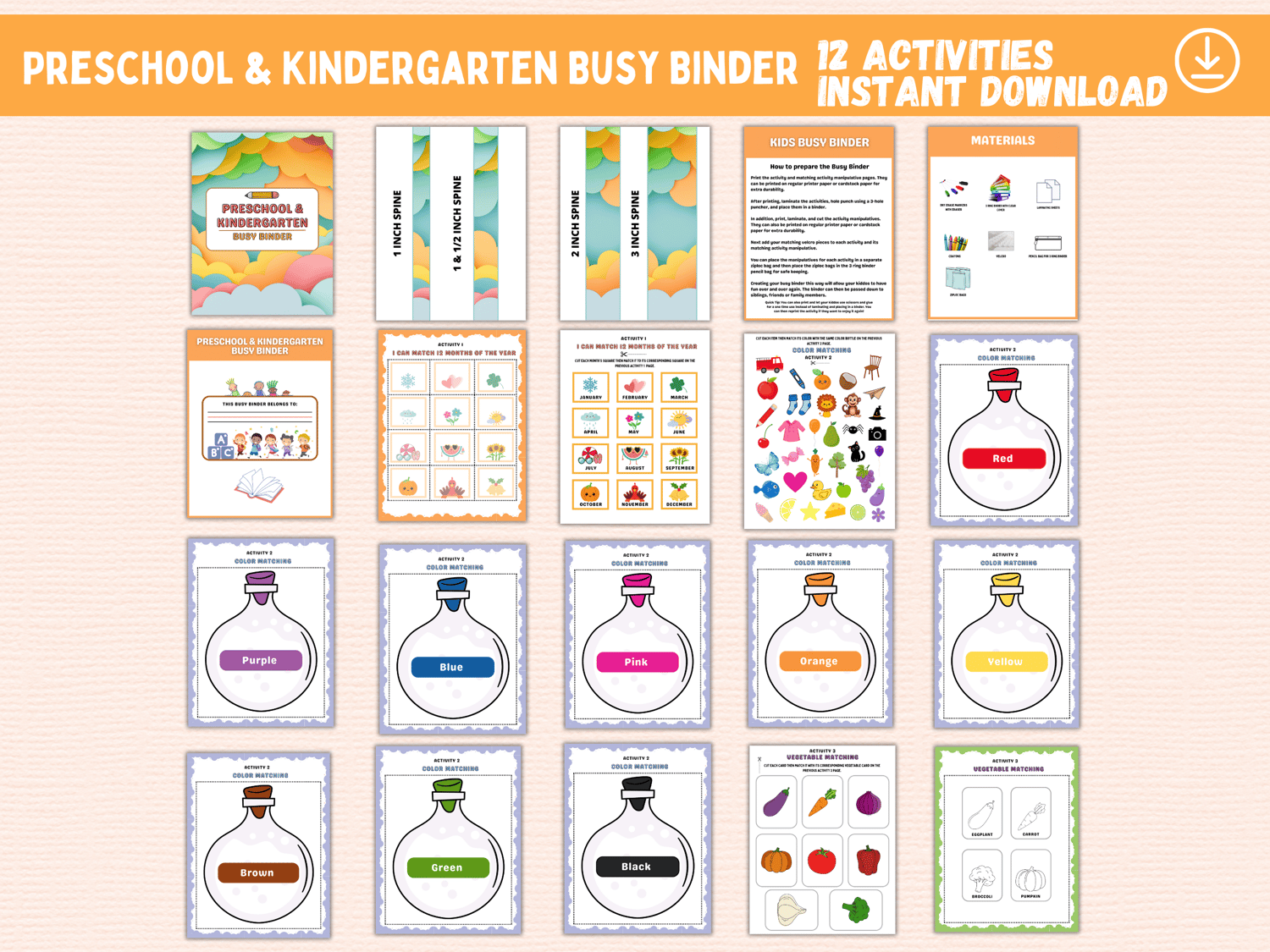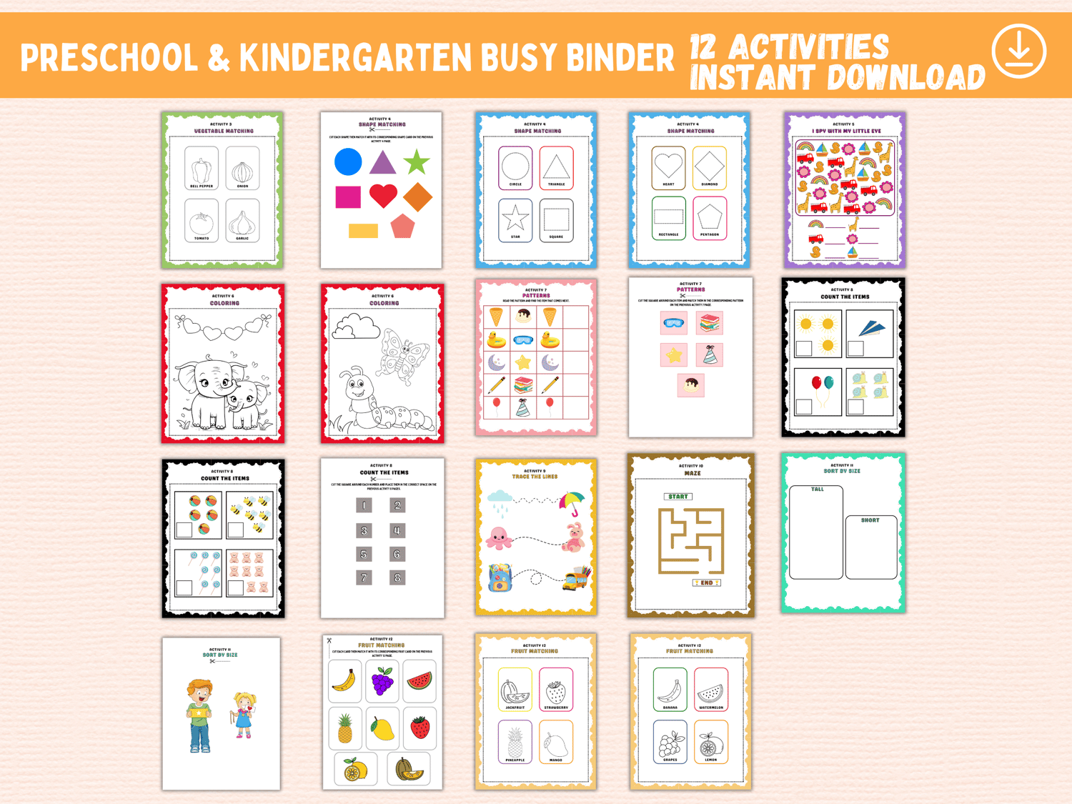 Keep your little learner engaged with this colorful Preschool & Kindergarten Busy Binder! Perfect for ages 3–6, this instant download is packed with 12 hands-on activities designed to make learning fun at home, in the classroom, or on the go.