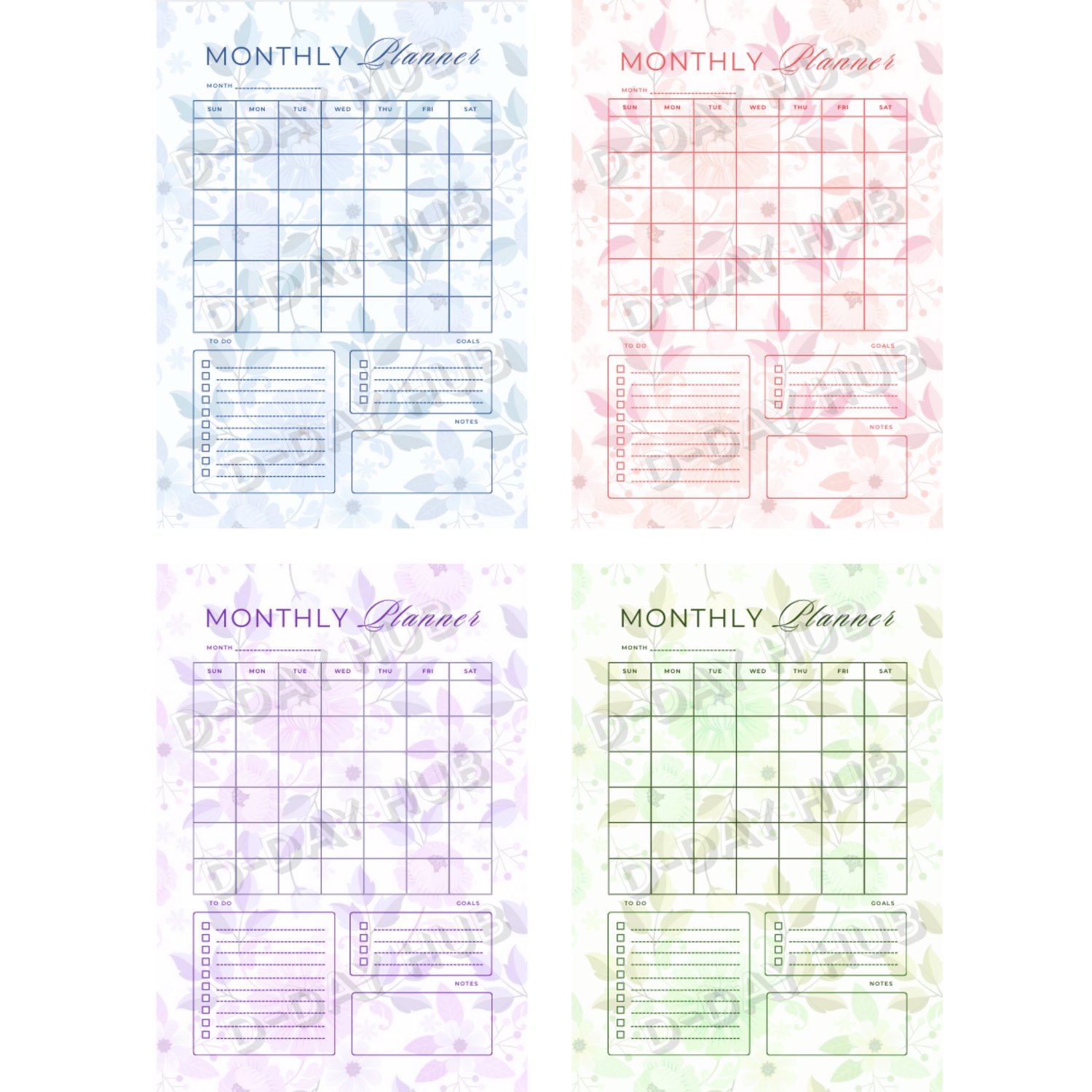 Plan your month with a touch of nature's elegance. This Modern Monthly Calendar provides a clean, distraction-free space to organize your schedule while a subtle floral background adds a sense of calm and beauty. The calendar includes four identical layouts, each featuring a unique and vibrant floral pattern in blue, purple, green, and red, so you can choose a different theme to match your mood.