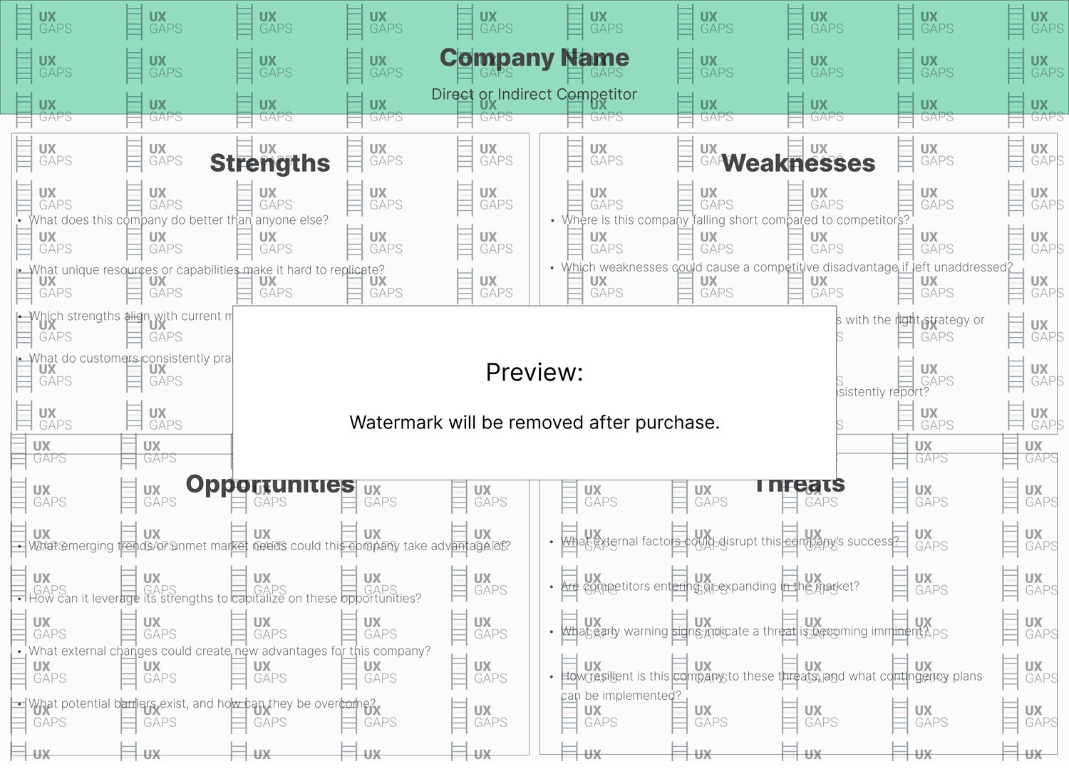 This isn’t just a blank SWOT grid. It’s a guided framework that helps you organize your research, spark ideas, and present insights that feel polished, professional, and portfolio-ready.