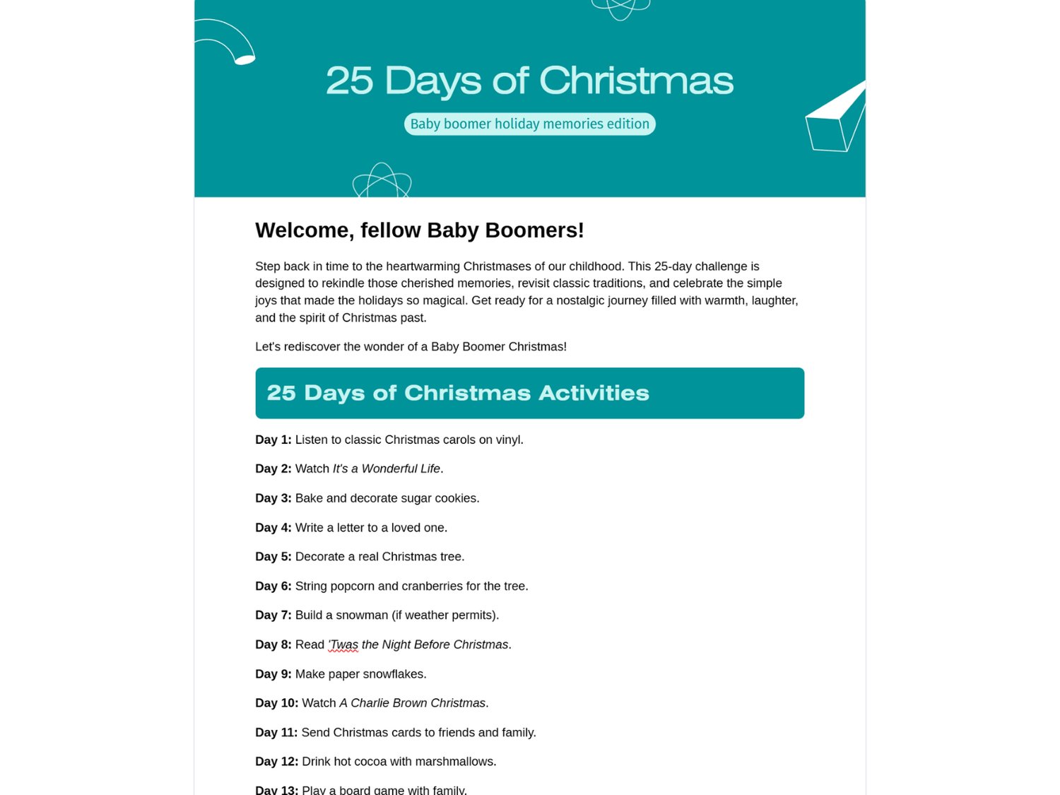 Relive the classic Christmas seasons of your childhood with this beautifully crafted 25-day holiday challenge designed especially for Baby Boomers (born 1946–1964).