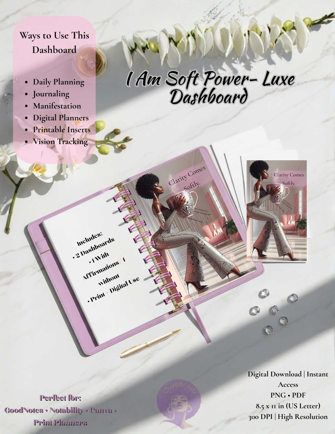 The I AM Luxe Dashboard is created for women who move with intention, confidence, and unapologetic self-expression. Rooted in modern luxury, melanated beauty, and calm boss energy, each dashboard transforms your planner or journal into a daily ritual of alignment, focus, and affirmation.