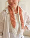 The scarf is worked from tip to tip with built-in i-cord edging. The stitch pattern is composed of 2x1 rib with dip stitches worked once in a few rows. There are two sizes offered for the width with the possibility to make an even wider one, and the length is also easily adjustable.