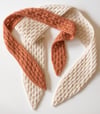 - Sample scarf, Size Small, terracotta: Kinu from Ito (100% silk; 465yds / 425m, 1.75oz / 50g) in color Cayenne Red held together with Sensai from Ito (60% mohair, 40% silk; 262yds / 240m, 0.7oz / 20g) in color Gold Oak