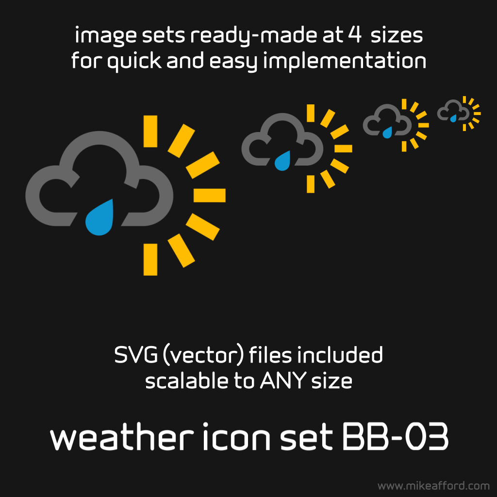 Ready-made at four different sizes for quick and easy implementation. You also get the complete set in vector format (SVG) – scalable to any size. 92 weather conditions in total (see list below).