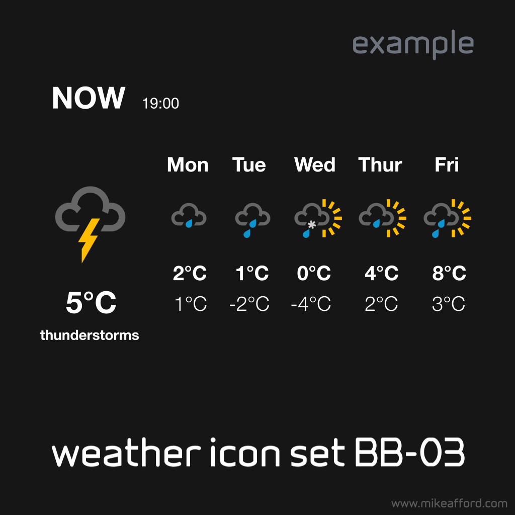Inspired by the classic BBC Weather Symbols, this icon set has been lovingly created from scratch with a number of subtle differences that distinguish them from the original inspiration. Think of these as our 'Arial' to the BBC's 'Helvetica'.
