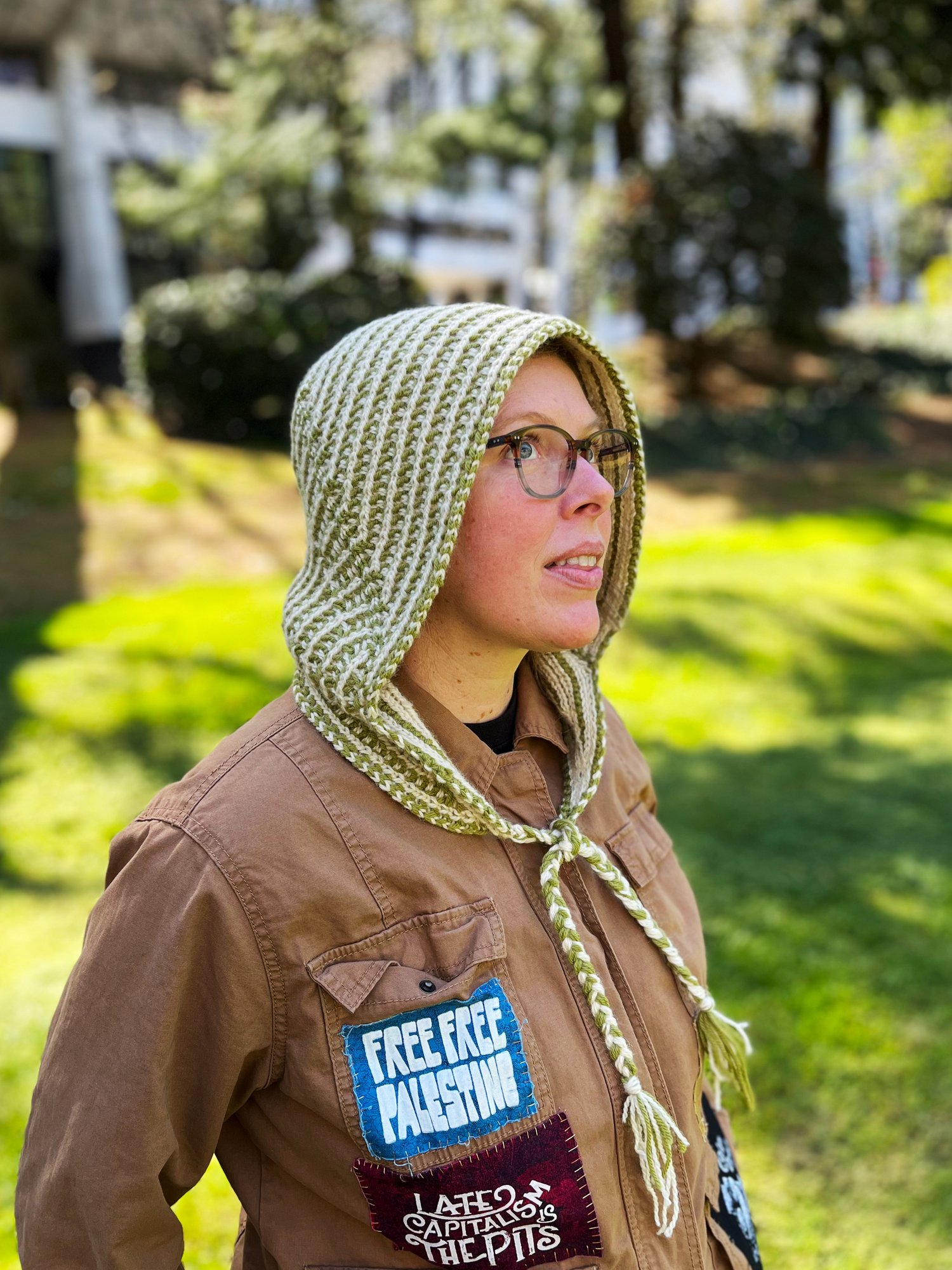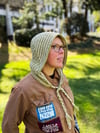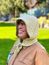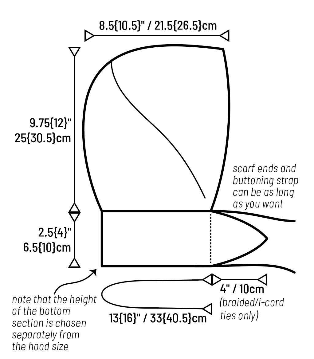 The main hood is a regular pattern with two sizes in two sections, using short rows, increases, and decreases for shaping—the top of head is worked sideways with stitches made along the back edge for later, and the back of head is worked back and forth with short rows and decreases. The bottom section then offers several choices; a narrow or wide bottom can be paired with either hood size, and any hood can have scarf ends, a buttoning strap, or i-cord/braided ties.