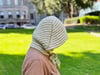 This pattern is written for small{large} sizes—the small size is a short, fitted hood for an adult, meant more to be a child size; the large size is an adult size hood that comes out over the face to protect from a light rain or wind (see schematic for all measurements). If you wish to slightly adjust the size, you may adjust your gauge to be a little bigger or smaller.