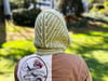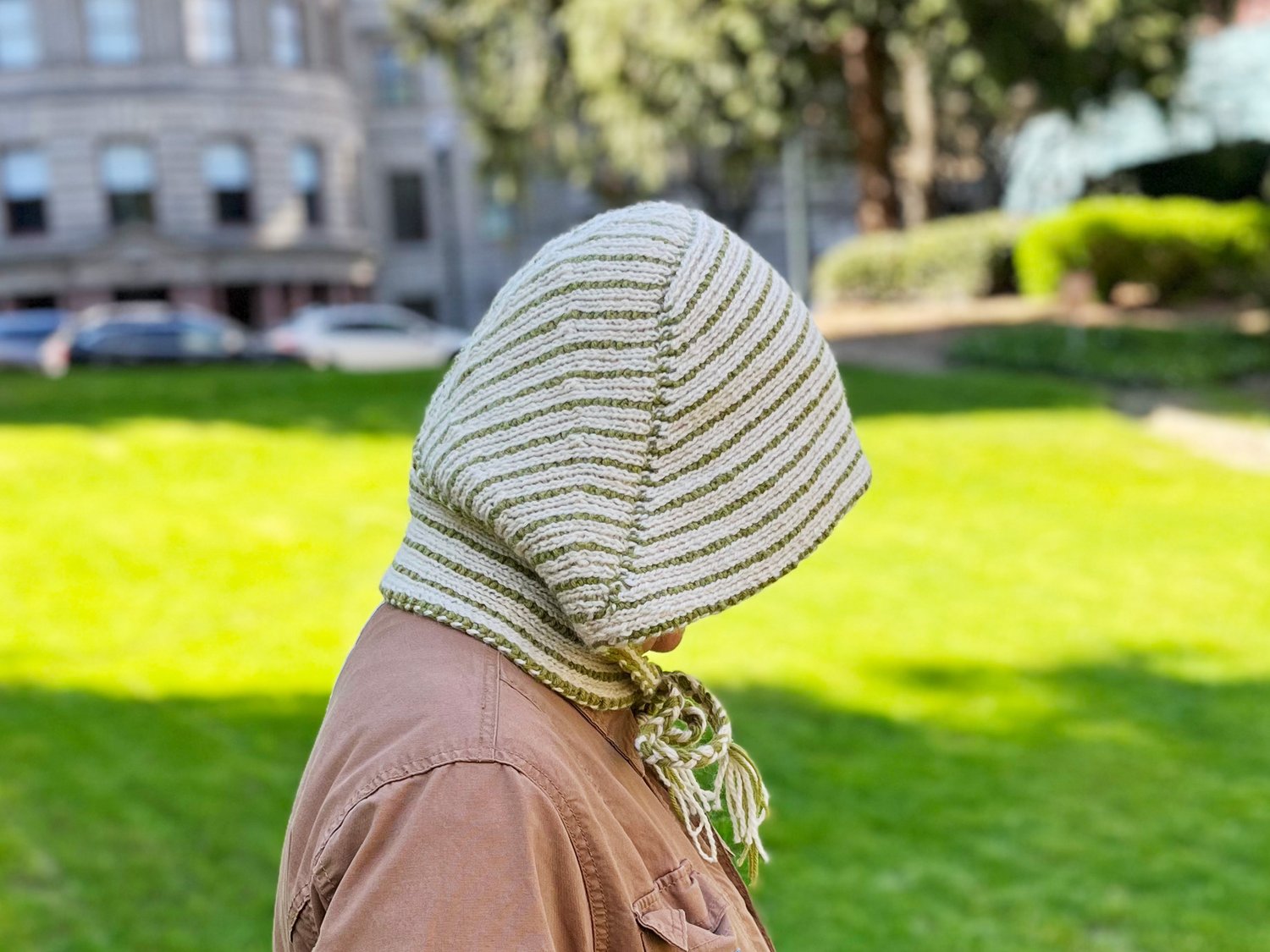 Bobbie Hood is a comfy hood accessory, knit modularly in two colors of worsted weight yarn, that’s totally reversible for two different looks, and includes several different options for the bottom section: braided or i-cord ties, a buttoning strap, or full scarf ends!