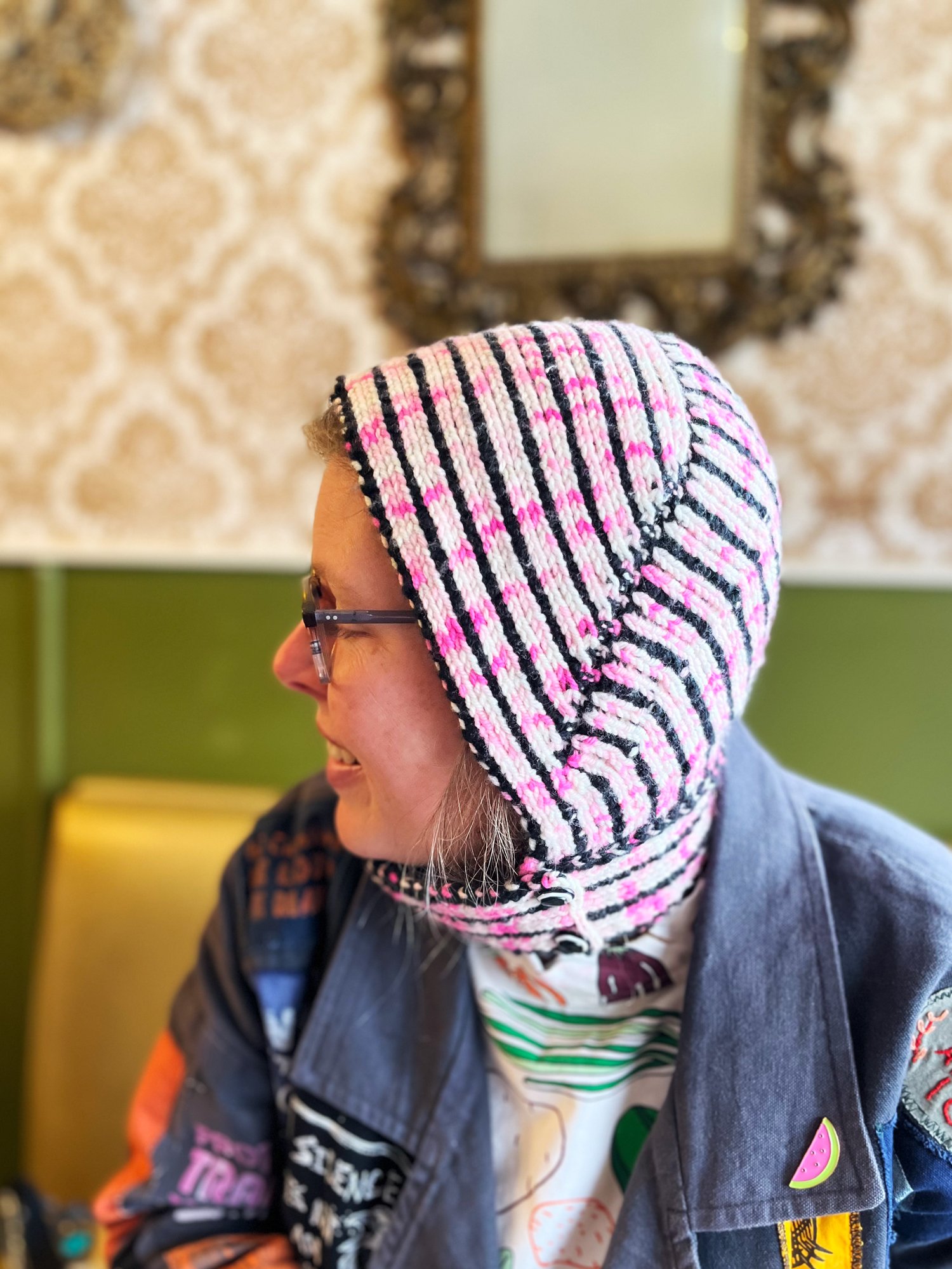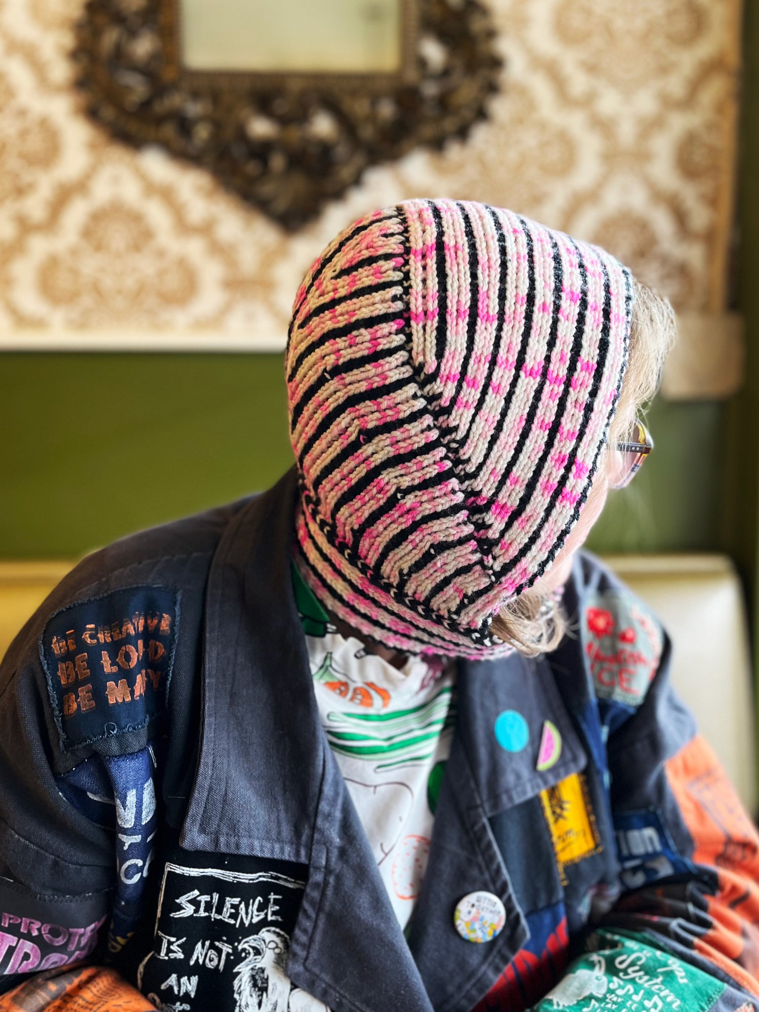 I chose this stitch pattern because A: the slipped stitches make a dense fabric for a warm, thick hood, and B: it’s reversible! The hood is designed intentionally to be able to wear it with either side out, for two different looks. Choose highly contrasting yarns for a bolder look, or more similar colors for a subtle design.